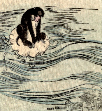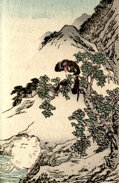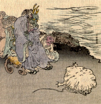 “Oh! that’s your little game,—is it?” thought the Monkey. But he kept his thoughts to himself and only said: “Nothing could please me better than to be of service to Their Majesties. But it so happens that I left my liver hanging to a branch of that big chestnut-tree, which you found me skipping about on. A liver is a thing that weighs a good deal. So I generally take it out, and play about without it during the day-time. We must go back for it.”—The[16] Jelly-Fish agreed that there was nothing else to be done under the circumstances. For,—silly creature that he was,—he did not see that the Monkey was telling a story in order to avoid getting killed, and having his liver used as medicine for the fanciful young Dragon Queen.