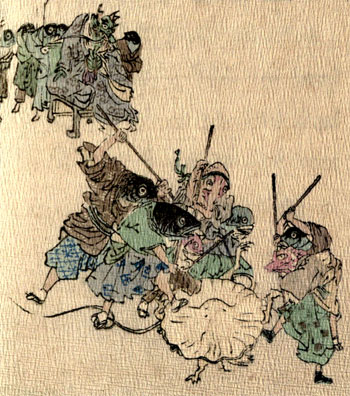 So the Jelly-Fish started off a second time; and when he got home, he told the Dragon King everything just as it had happened. But the King flew into a passion with him for his stupidity, and hallooed to his officers, saying: “Away with this fellow! Take him,[19] and beat him to a jelly! Don’t let a single bone remain unbroken in his body!” So the officers seized him, and beat him, as the King had[20] commanded. That is the reason why, to this very day, Jelly-Fishes have no bones, but are just nothing more than a mass of pulp.