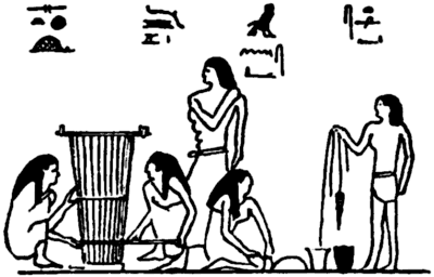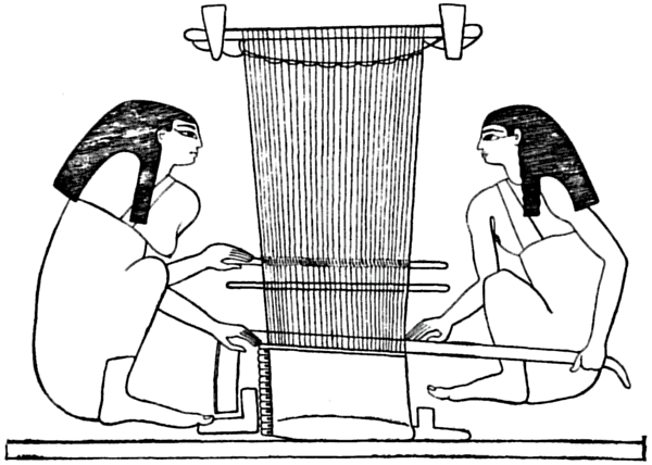 IN the tomb of Chnem-hotep, at Beni Hasan, there is a wall painting of a horizontal loom with two weavers, women, squatting on either side, and at the right in the background is drawn the figure of the taskmaster. There are also figures represented in the act of spinning, etc. For the present we are concerned with the weaving only.
