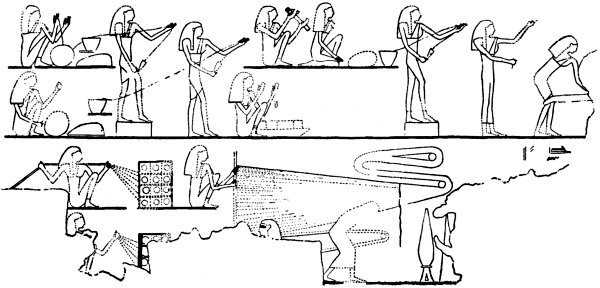 Of this illustration, there appear to be six reproductions. We have first of all, Fig. 1, that of Fred. Cailliaud (Recherches sur les Arts et Métiers, etc., Paris, 1831) with illustrations of drawings made by himself in the years 1819 to 1822. His publication was followed [Pg 5] by Fig. 2, that of Sir J. G. Wilkinson (Manners and Customs, etc., London, 1837). Mr. John Murray, whose house has published Wilkinson’s work from the first edition to the last, informs me that a few of the drawings were made by George Scharf, afterwards Sir George Scharf, Keeper of the National Portrait Gallery, but that most of them seem to have been made by Joseph Bonomi, the well known Egyptologist. Wilkinson’s woodcut, although clearly and neatly done, is on a very small scale; nevertheless it admits of a fair comparison with those reproduced on a larger scale.