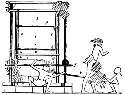 | ” 3. Putting in the woof, but not by a shuttle thrown with the hand. | ” 6. Twisting the double threads for the warp. | ||