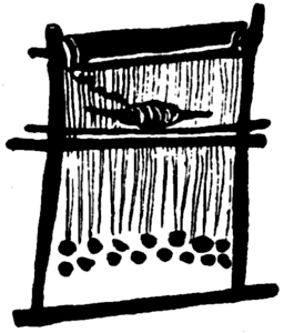 The principle is the same throughout, viz.: the looms are vertical, there is a warp beam on top, there are two cross rods one of which is a laze rod and possibly the other is a heddle; and the warp threads are all kept taut by means of attached weights. On one of the Boeotian looms a bobbin or spool is shown. Along the top of Penelope’s loom there are indications of nine pegs, on six of which balls of coloured thread have been placed, evidently for working out the designs, very much the same as shown on the rug loom in Bankfield Museum already referred to. The warp weights on this Athenian illustration are triangular in shape, and perhaps resemble the pyramidic weights found in Egypt and attributed to Roman times. Assuming these pyramids are Roman warp weights it would appear that both Greeks and Romans had vertical looms on which the warp threads were kept taut by means of weights. In one of the few clearly expressed technical classical references, Seneca speaks of the warp threads stretched by hanging weights.