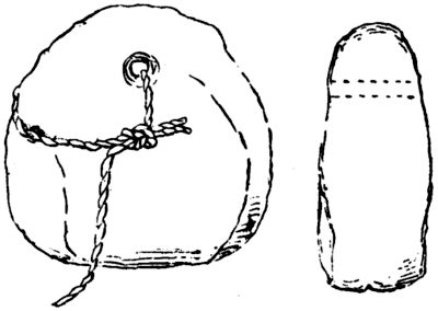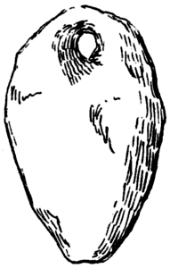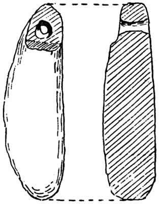 In 1875 several flat irregular oblong perforated pieces of soft chalk were found in enlarging the cattle market in Great Driffield, Yorkshire; they were found in a hole about three feet deep with Anglo-Saxon potsherds, animal remains, and bits of iron. They can now be seen in the Mortimer Collection in the Hull Museum. They consist of pieces of chalk, similar to those which drop annually in thousands upon thousands down the cliffs from the boulder clay between Bridlington and Flamborough. On some a shoulder has been cut, Fig. 34, most have one perforation, but in a few specimens, where the thin portion above the hole has been broken off, a second hole has been made. None of them can stand unsupported. Owing to the soluble nature of the chalk they could not have been used as net-sinkers in the sea (about nine miles off) for they would quickly dissolve in salt water, and the same holds good in regard to fresh water, although in a lesser degree. But I do not think they were used even in [Pg 38] fresh water as net-sinkers, for it was a characteristic of primitive peoples, with whom time was of no account, to do their work thoroughly—what they made was intended to last, and chalk net-sinkers would not have lasted. That these were found in a limited quantity, I believe about seventeen in number, tends to show that they are warp weights, for only a few are required for every loom, in spite of the considerable number shown in the non-technical illustration of Penelope’s loom. Not being able to find any other use for these pieces of chalk, and judging that they are suitable for the purpose, I should say they are warp weights. In this case the weaver has made the most of what nature has given him; in other parts of England he has had to fashion the weight out of the rough chalk, Fig. 35.