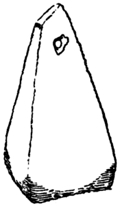 Fig. 35.—“Chalk weight, 6" × 4" × 2" (15·2 cm. × 10·2 × 5·1), similar to those found in pits, at Mount Caburn and Cissbury near Worthing, Sussex. Found with eighteen more in the filling of pit 7, Winkelbury Hill.” Excavations in Winkelbury Camp, by Lieut.-Gen. Pitt-Rivers (Excavations in Cranbourne Chase, Vol. II., 1888). As Pitt-Rivers also found at Winkelbury the fragment of a comb and a chalk spindle whorl, which are textile tools, we may safely presume these fashioned pieces of chalk are warp weights.