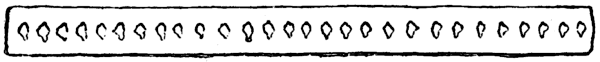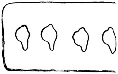 A piece of frame, Fig. 24, has been described as a “weaver’s beam” for making rush mats like the modern hasira. It is provided with 28 holes which are arranged about 27 to 40 mm. apart. The holes may have been more or less circular originally, and worn into present shape by threads, etc., and look more irregular inside than they really are, as the inside surface of the holes is fairly smooth; the holes are slightly larger, on an average about 4 mm., on the face shown than on the other face. Prof. Flinders Petrie seems to think it resembles the frame on which the modern Egyptian mat is made.