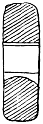 Fig. 34.—Side view and section of chalk warp weight found at Great Driffield. Of three of the weights the following dimensions were taken: