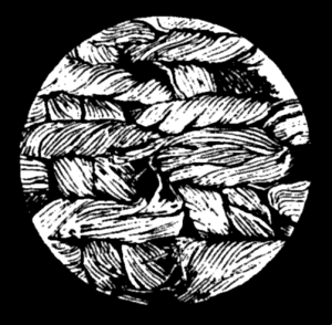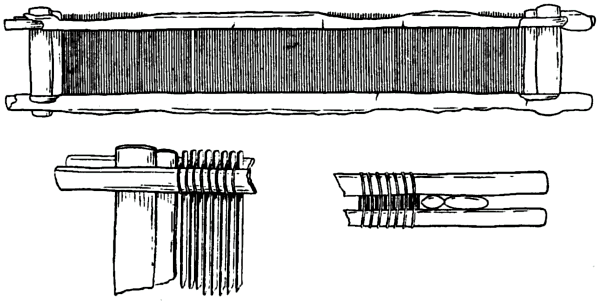 In the above classical illustrations which are after all only rough diagrams, the warp weights appear to hang from a single thread only, but this can not have been correct. The warp threads must have been bunched, because a single suspended thread with a tension weight immediately begins to unravel, and so loses the advantage of its having been spun, as any one can ascertain for oneself. As regards the same point on the Lake Dwellers looms, Cohausen was the first to surmise that the warp threads were bunched to receive the weight, and Messikommer proved it by practical experiment.[G]