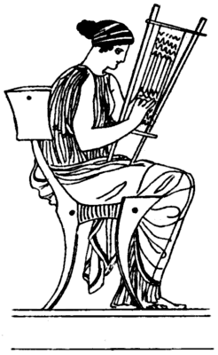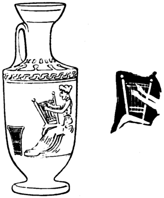 The Greeks were, however, acquainted with the tapestry loom, for there exists in the British Museum a small lekythos with an [Pg 32] illustration, Fig. 29a, of such an article resting on the knees of a lady weaver.[F]