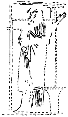 Fig. 31.—Penelope at her loom. Illustration on an Athenian skyphos found in an Etruscan tomb at Chiusi, and at present in the museum there. The illustration is taken from Monumenti d. Inst. Archeologico, IX., pl. xlii.