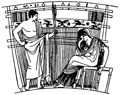 [I] He criticises the detail of the illustration of Penelope’s loom. It must be remembered this illustration is not a technical drawing, but an artist’s representation where correctness of detail cannot be expected. In his own drawing of the Egyptian horizontal loom many of the warp threads are shown over instead of under the laze rods, and yet this is supposed to be a correct technical drawing!