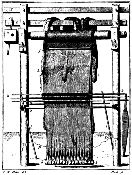 a a Beam on which the warp is fixed. b b Weights to make the warp taut. c c Brackets which support the beam and on which it can be revolved by means of the spoke e when the warp has to be lengthened, on account of the weft f working downwards and so shortening the finished portion of the woven cloth. g A sharp bone or tough piece of wood to beat the weft into proper position. h The wound up weft which is pushed through the warp with the fingers. i i The unbeamed warp. k k The heddles or shed openers. l l The supports on which the heddles rest when the “pick” is made [i.e., the pushing the weft through]. m The beater-in. n and o Laze rods. q The template for regulating the width of the cloth. r r and s s Beam on to which the loom is fixed.