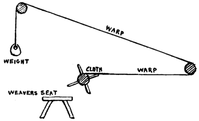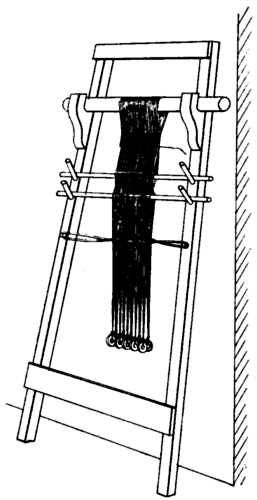 [A] To the uninitiated I may explain that in a horizontal loom the plane of the warp is more or less parallel with that of the floor, while in an upright or vertical loom the plane of the warp is at right angles to that of the floor.