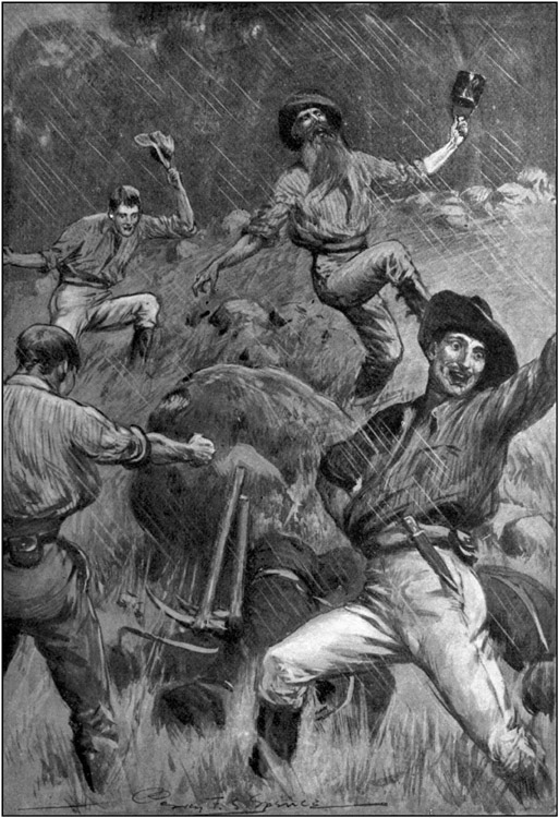 From the windward side of the verandah he and Slaughter leaped to the ground. The smoke was rolling towards them in great opaque billows and the air scorched their faces, for through the dense mass they saw the lurid gleam of the flames leaping and springing like living things thrown out in a skirmishing line across the grass-covered stretch of country. They dashed forward towards it, their eyes half blinded, their lungs choking, and their skin blistering.