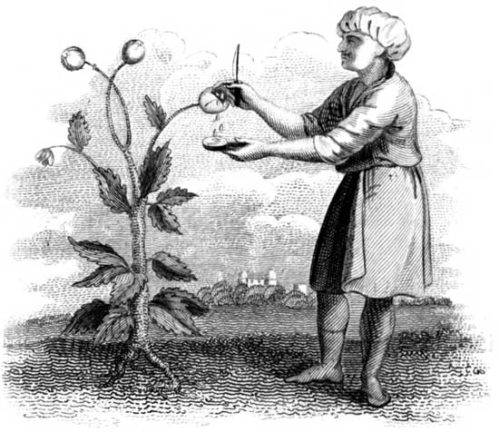 [93] It was at this period of his residence at Lichfield, that the present writer heard him strongly enforce the cultivation of papaver somniferum. What he may have also enforced to others, may possibly have given rise to some of those ingenious papers on its cultivation, which are inserted not only in the Transactions of the Society for the Encouragement of Arts, Manufactures and Commerce; in other publications, but in the first and fifth volumes of the Memoirs of the Caledonian Horticultural Society. The papers of Mr. Ball and Mr. Jones, on its cultivation, in the former of these transactions, are particularly diffuse and valuable. They are fully noticed in Dr. Thornton's "Family Herbal." The subjoined plate is a copy of that in the title page to "Opiologia, ou traicté concernant le naturel proprietés, vraye preparation, et seur vsage de l'opium," a favourite volume with Dr. Darwin, printed at la Haye, 1614, 12mo. Dr. Darwin, in his Botanical Garden, thus speaks of opium: "the finest opium is procured by wounding the heads of large poppies with a three-edged knife, and tying muscle-shells to them, to catch the drops. In small quantities it exhilirates the mind, raises the passions, and invigorates the body; in large ones, it is succeeded by intoxication, languor, stupor, and death."