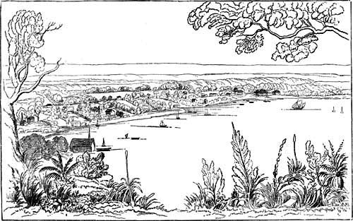 2. Port Jackson.—As soon as the ships had anchored in Botany Bay, convicts were landed and commenced to clear the timber from a portion of the land; but a day or two was sufficient to show the unsuitability of Botany Bay for such a settlement. Its waters were so shallow that the ships could not enter it properly, and had to lie near the Heads, where the great waves of the Pacific rolled in on them by night and day. Governor Phillip, therefore, took three boats, and sailed out to search for some more convenient harbour. As he passed along the coast he turned to examine the opening which Captain Cook had called Port Jackson, and soon found himself in a winding channel of water, with great cliffs frowning overhead. All at once a magnificent prospect opened on his eyes. A harbour, which is, perhaps, the most beautiful and perfect in the world, stretched before him far to the west, till it was lost on the distant horizon. It seemed a vast maze of winding waters, dotted here and there with lovely islets; its shores thickly wooded down to the strips of golden sand which lined the most charming little bays; and its broad sheets of rippling waters bordered by lines of dusky foliage. The scene has always been one of surpassing loveliness; but to those who [Pg 13] filled the first boats that ever threw the foam from its surface, who felt themselves the objects of breathless attention to groups of natives who stood gazing here and there from the projecting rocks, it must have had an enchanting effect. To Captain Phillip himself, whose mind had been filled with anxiety and despondency as to the future prospects of his charge, it opened out like the vision of a world of new hope and promise.