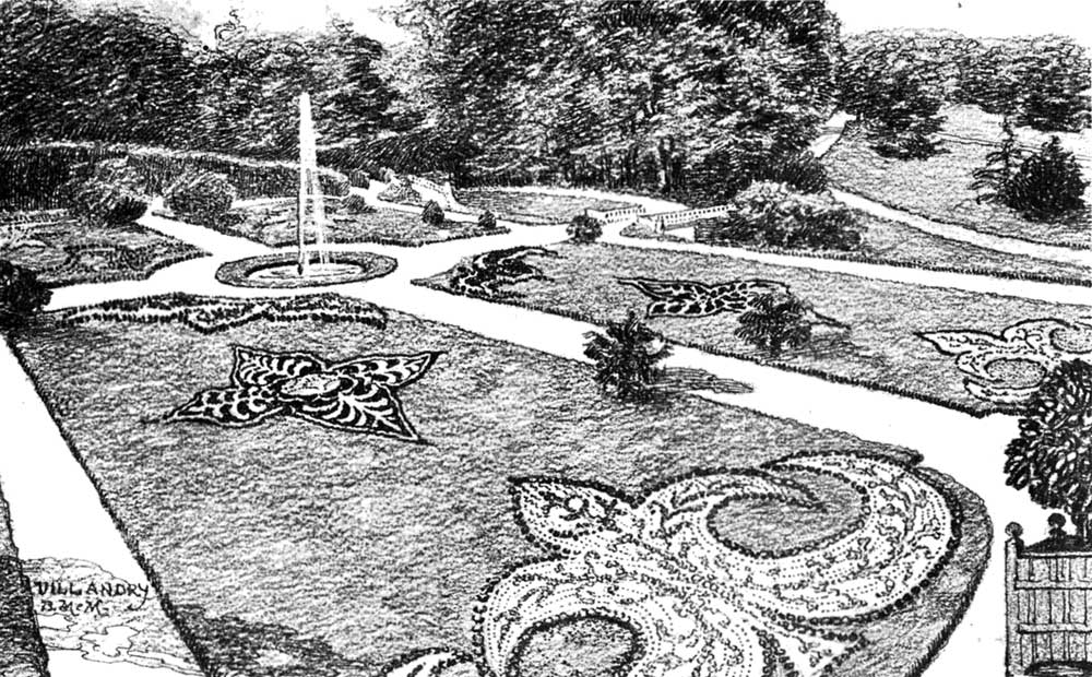 The real French garden is here to be seen almost at its best, its squares and ovals of grassy green apportioned off from the mass by gravelled walks and ornamented waters. The "tapis d'orient" effect, so frequently quoted by the French in writing of such works, is hardly excelled elsewhere.