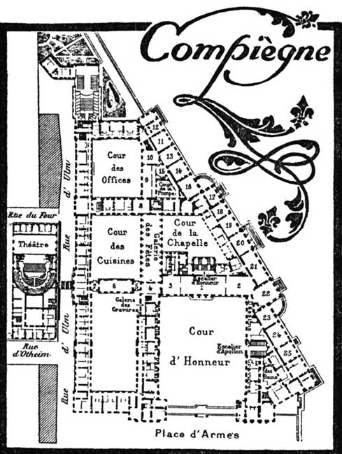 One of the most talked of and the least visited of the minor French palaces is that of Compiègne. The archeologists coming to Compiègne first notice that all its churches are "malorientées." It is a minor point with most folk, but when one notes that its five churches have their high altars turned to all points of the compass, instead of to the east, it is assuredly a fact to be noticed, even if one is more romantically inclined than devout.