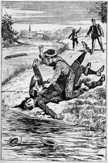 Both the hats of the Boston youths were floating down the river, and they were so close to the water’s edge that they were covered with mud. The vigor of the assault on the two was increased rather than diminished, and we spectators were cruel enough to laugh heartily over the exhibition, accompanied as it was by the frenzied yells of the two lads who were receiving the wrathful attentions of Ben Mayberry.