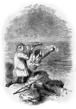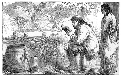“Now, men, draw the boat higher on shore, ere the tide go out and float her away,” said the master; but when the pinnace was drawn to the dry sand she was found to be so battered and so full of holes, that they all saw at once that it was useless to hope that they could ever put to sea in her again. “We will make her serve for a shelter at least,” said Christoforo, and 22 so, dividing her into two parts, they, with the help of her sails, made two huts, in which the twenty-one sailors, who alone were left, might find some slight shelter from the winter wind.