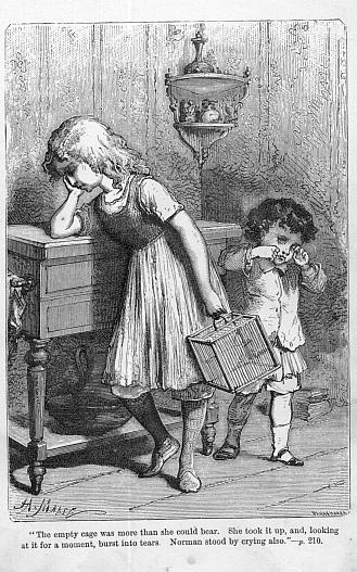 As soon as it was morning, Fanny hurried to her little brother’s room. Her grief and pain were very great when she heard him crying out, “Take the birds away, oh, don’t let them tease me!”