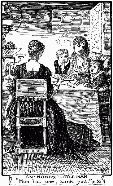"How big are they?" she said to herself. "Bigger than my thumb? Oh yes, a good deal. I should think they are about as tall as my arm would be if it was standing on the ground. I should think they would come up above my knee. I should like to stand up and measure, but perhaps it is better for me not to speak to them till they speak to me."[197]
