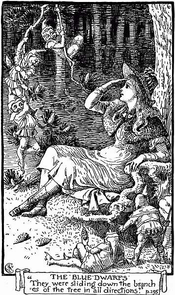 The two dwarfs took no notice of what she said, but suddenly turned round, and standing with their backs to Olive called out shrilly, "Guten Tag." Immediately all the other dwarfs replied in the same tone and the same words, and to Olive's great surprise they all began to move towards her, but without altering their attitudes—those on the barrel rolled towards her without getting off it; the two who were hugging their knees continued to hug them, while they came on by means of jerking themselves; the turning head-over-heels ones span along like wheels, and so on till the whole assemblage were at her feet. Then she saw unfolded before her, hanging on the branches of the tree, a large mantle, just the shape of her aunt's travelling dust-cloak, which she always spread over Olive in a carriage, only, instead of being drab or fawn-coloured, it was, like the dwarfs'[201] jackets, bright blue. And without any one telling her, Olive seemed to know of herself that she was to put it on.