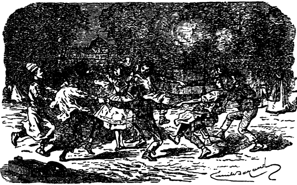 La bande de gamins disparut comme une nuée d'oiseaux, en chantant à tue-tête.