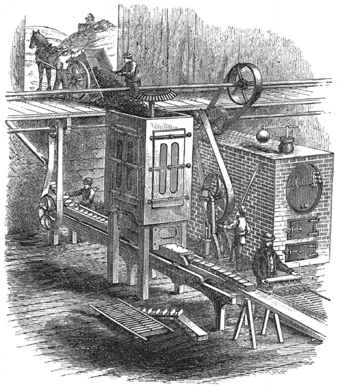On the bog of Allen, in Ireland, we have an example of this kind. Peat is placed in iron ovens in the form of truncated pyramids, the bottoms of which consist of movable and perforated iron plates. The ovens are mounted on wheels, and run on a rail track.