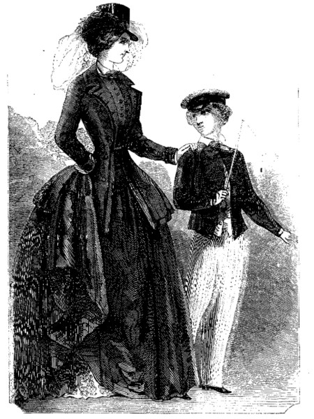 I. Ladies' Equestrian Costume.—Riding-habit of green cloth or cashmere; the skirt very long and full, and the corsage fastened from the waist to the throat by a row of fancy silk buttons of the color of the habit. A pardessus or polka jacket of cinnamon-colored cloth or merino. It has rather a deep basquine, and the corsage, which has a turning over collar and lappels, is open in front of the bosom. It is edged with a narrow band of black velvet. The sleeves are long, close to the arms, and slit open at the lower part, showing under sleeves of white cambric of moderate fulness, gathered on bands at the wrists. The pardessus is confined in front (not quite so low as the waist) by a gilt agrafe. Round the throat a small collar of worked muslin or a necktie of plaided ribbon. Round riding-hat of black beaver, with a small cock's-tail plume on one side. Veil of a very thin green or black tulle. Under the habit a jupon of cambric muslin with a deep border of needlework. Pale yellow riding gloves, and black boots.