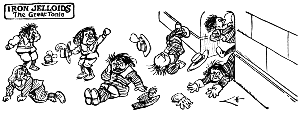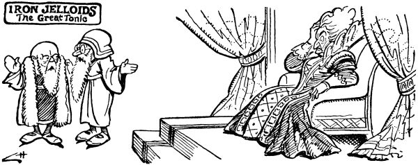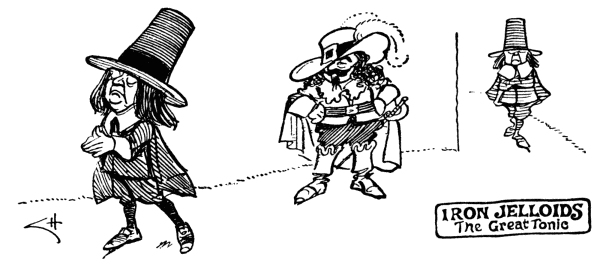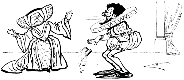At sight of cumbrous crinoline.