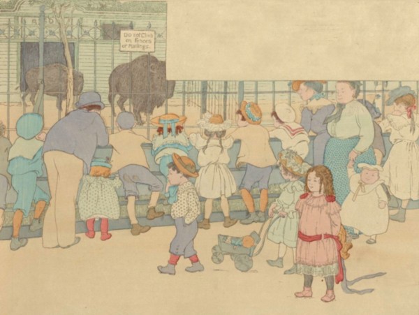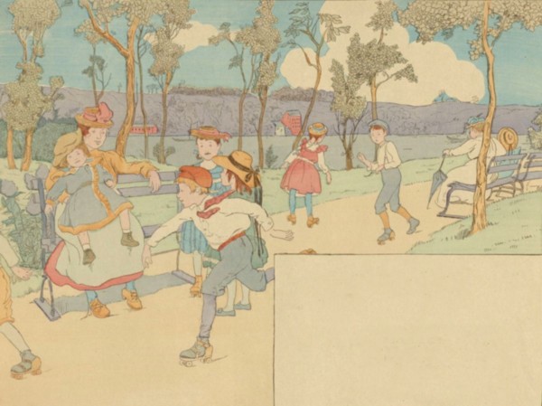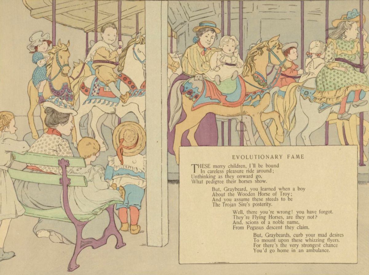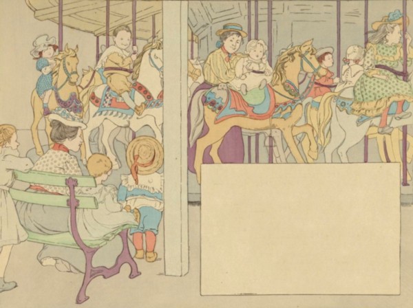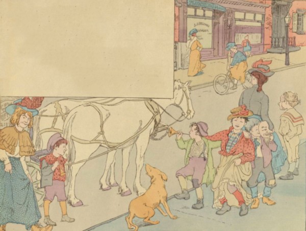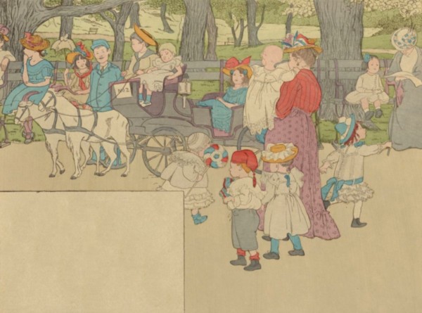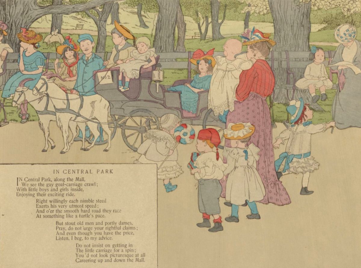 We see the gay goat-carriage crawl;