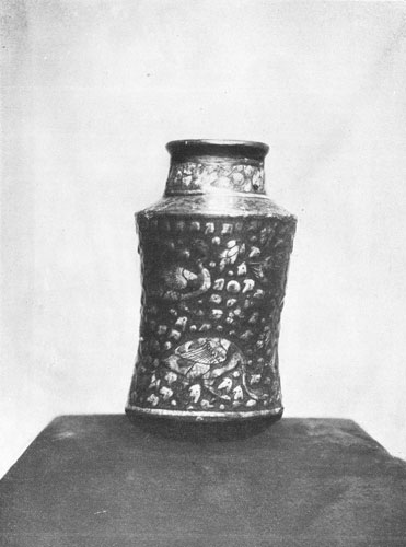 FAIENCE CYLINDRICAL VASE, WITH RELIEF AND LUSTRE DECORATION. FROM FOSTAT (ANCIENT CAIRO), DYNASTY OF FATIMID ANTI-CALIPHS (A.D. 974-1171)