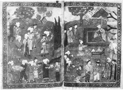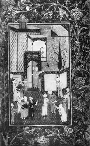 Representing Timur-i-Lang (A.H. 736-807) attending a festival. The name and the full titles of Timur appear in excellent Thuluth lettering round the border of the rug upon which the monarch sits.