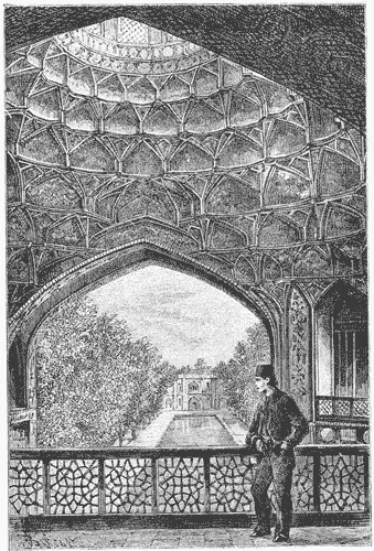 "At the upper extremity a two storeyed Pavilion connected by a corridor with the Seraglio of the palace, so as to enable the ladies of the harem to gaze unobserved upon the merry scene below, looked out upon the centre of the avenue. Water conducted in stone channels ran down the centre, falling in cascades from terrace to terrace, and was occasionally collected in great square or octagonal basins where cross roads cut the avenues. On either side of the central channel was a row of chenars and a paved pathway for pedestrians, then occurred a succession of open parterres, usually planted or sown. Next on either side was a second row of chenars, between which and flanking walls was a raised causeway for horsemen. At intervals corresponding with the successive terraces and basins, arched doorways with recessed open chambers overhead conducted through these walls into the various royal or noble gardens that stretched on either side and were known as the gardens of the throne; nightingale, vines, mulberries, Dervishes, etc. Some of these pavilions were places of public resort and were used as coffee houses, where when the business of the day was over the good burghers of Ispahan assembled to sip that beverage and inhale their Kalians the while. At the bottom quays lined the banks of the river and were bordered with the mansions of the nobility."
