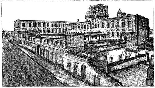 Dans mes nombreuses visites, j'arrive chez le président du club français et de la Chambre de commerce française. M. Jules Fort, avec une extrême amabilité, se fait mon cicérone et me conduit d'abord à l'hôpital (p. 362) français, sorte de maison de santé dirigée par les Sœurs de Saint-Joseph de Cluny. Notre colonie ne compte en ce moment qu'environ 500 membres, et la maison qui reçoit gratuitement les Français, reçoit, moyennant 2 soles par jour, les malades des autres nations. Elle est parfaitement tenue et jouit d'un beau jardin. Cette œuvre, qui a coûté à la petite colonie des centaines de mille francs, montre son patriotisme et sa charité: elle a aussi ouvert une école française pour les enfants des deux sexes.