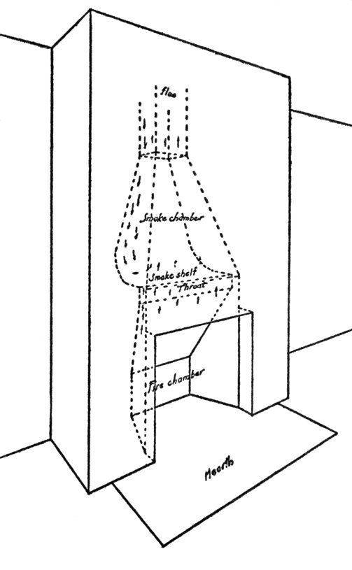Many fireplaces show a tendency to [50]smoke only when first lighted; this is probably due to a cold chimney, and can usually be prevented or made less objectionable by burning a newspaper just under the throat, thus starting the proper action of the up and down drafts.