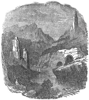 Louder and louder blew the wind, and darker grew the sky, and already had a distant flash and growling thunder announced the coming storm, when the two brothers arrived at the rocky eminence where, though the wood was above them, the river rolled nearly a hundred fathoms below. Some years before, a slip of ground had taken place at no great distance from the spot, when a mass of earth, amounting to well nigh half an acre, with the oak trees that grew upon it, slid down, all at once, towards the river. The rugged rent occasioned by the slip of earth, the great height of the road above the river, the rude rocks that here and there presented themselves, and the giant oaks of the wood frowning on the dangerous path, gave it a character at once highly picturesque and fearful. Austin, notwithstanding the[9] loud blustering of the wind, and the remonstrance of his brother to hasten on, made a momentary pause to enjoy the scene.