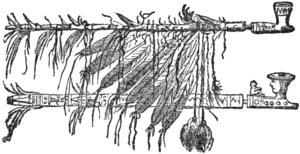 In five minutes after, the hunter was showing and explaining to his delighted young visitors the Indian curiosities which hung around the walls of his cottage, together with others which he kept with greater care. These latter were principally calumets, or peace-pipes; mocassins, or Indian shoes; war-eagle dresses, mantles, necklaces, shields, belts, pouches and war-clubs of superior workmanship. There was also an Indian cradle, and several rattles and musical instruments: these altogether afforded the young people wondrous entertainment. Austin wanted to know how the Indians used their war-clubs; Brian inquired how they smoked the peace-pipe; and little Basil was quite as anxious in his questions about a rattle, which he had taken up and was shaking to and fro. To all these inquiries the hunter gave satisfactory replies, with a promise to enter afterwards on a more full explanation.
