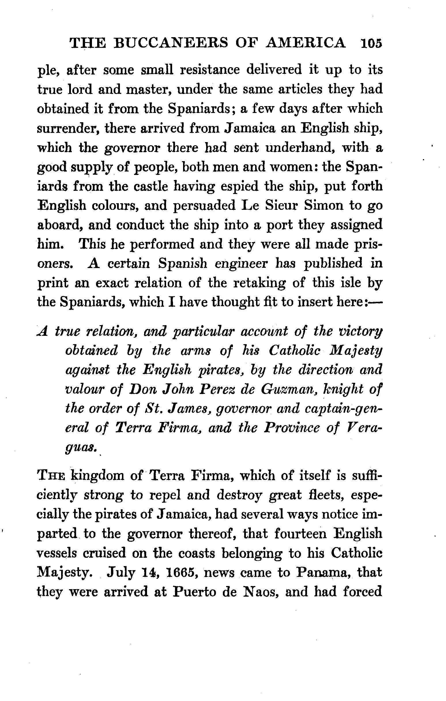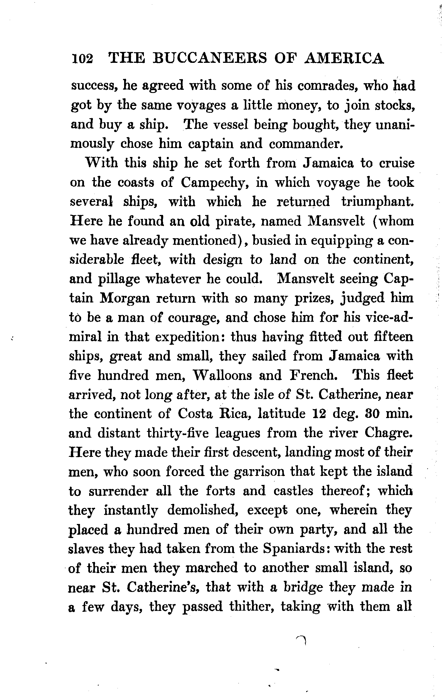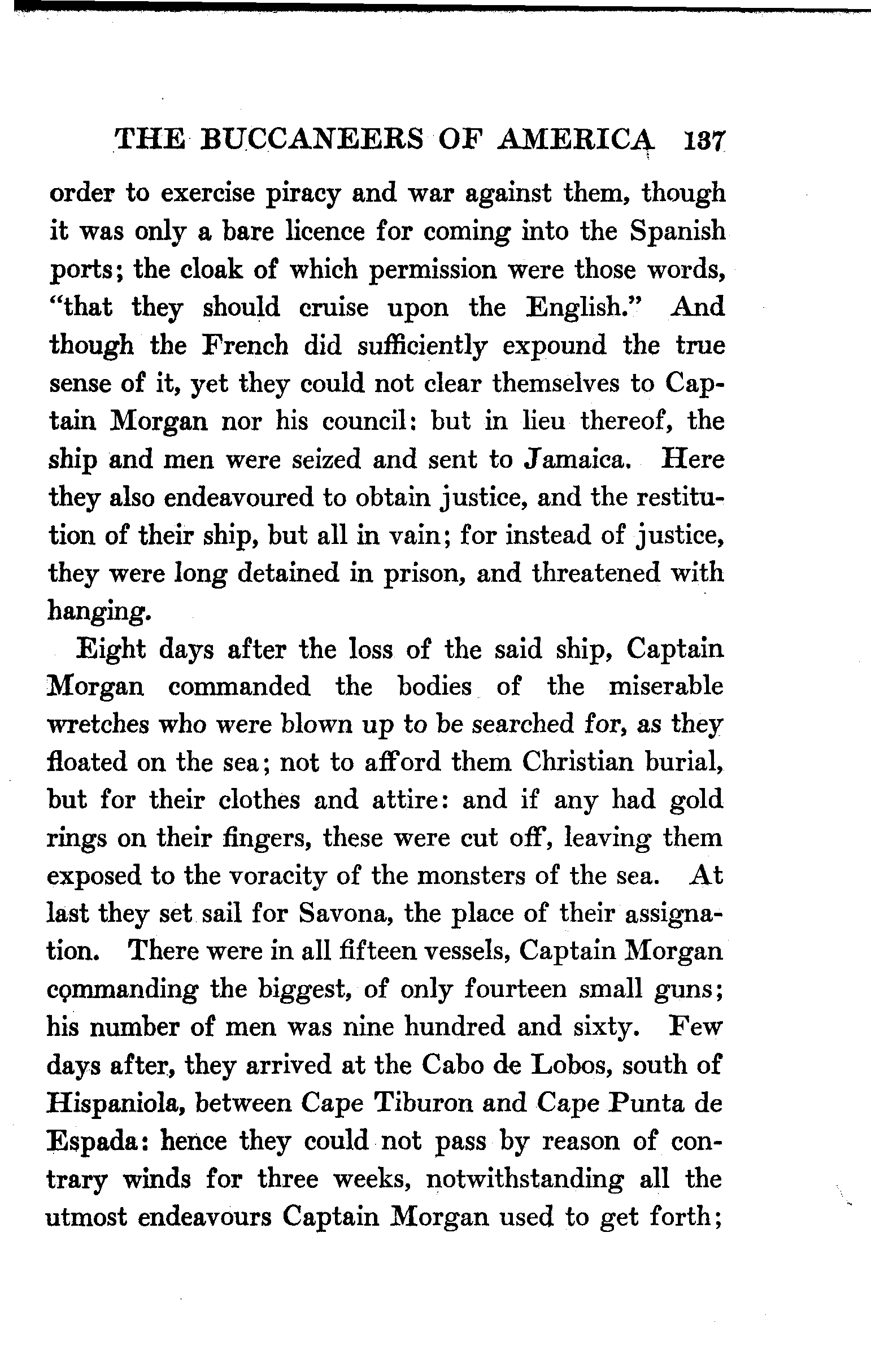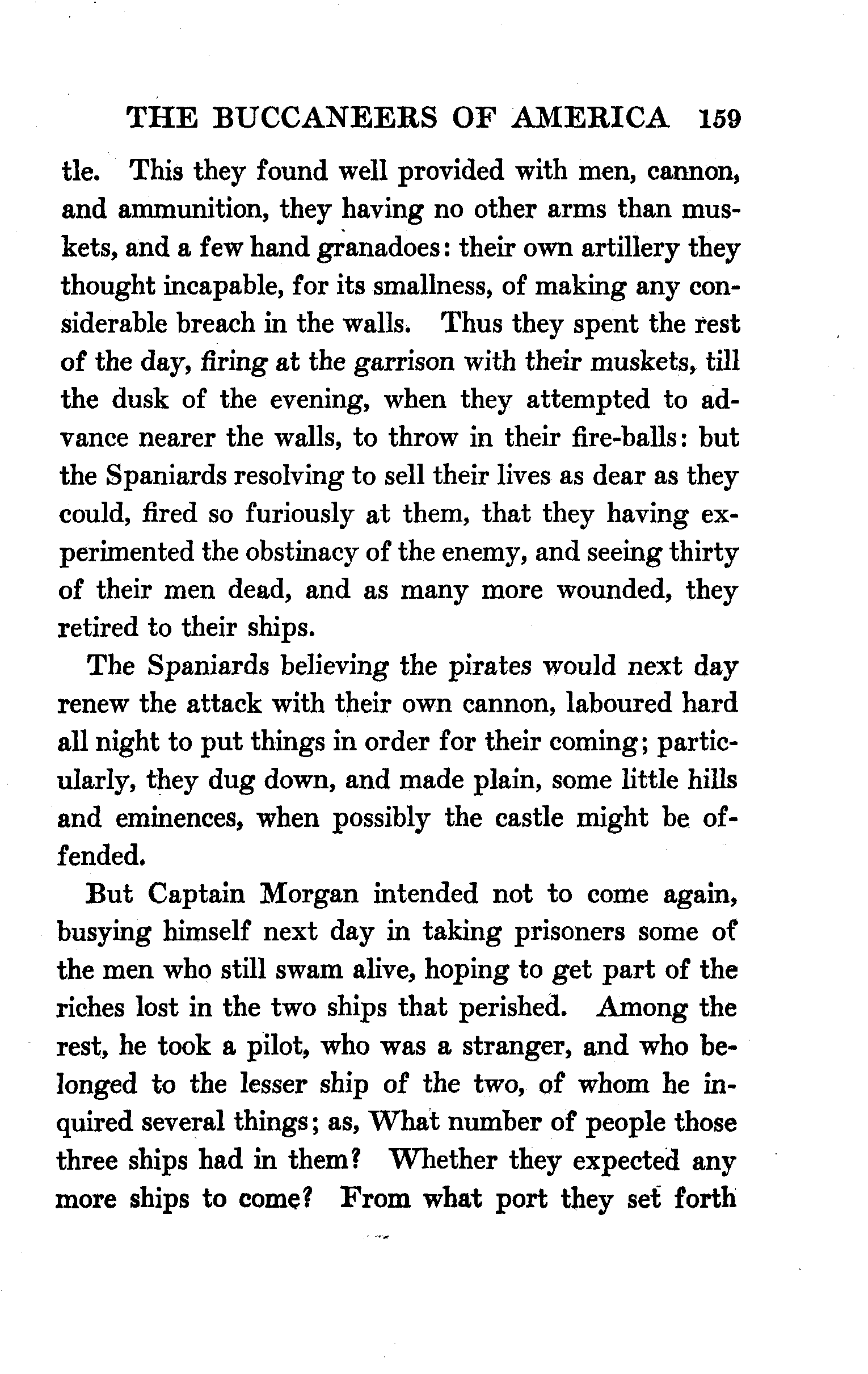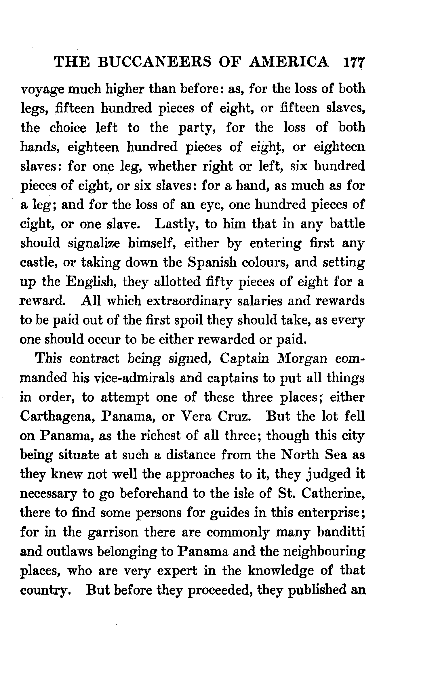 This contract being signed, Captain Morgan commanded his vice-admirals and captains to put all things in order, to attempt one of these three places; either Carthagena, Panama, or Vera Cruz. But the lot fell on Panama, as the richest of all three; though this city being situate at such a distance from the North Sea as they knew not well the approaches to it, they judged it necessary to go beforehand to the isle of St. Catherine, there to find some persons for guides in this enterprise; for in the garrison there are commonly many banditti and outlaws belonging to Panama and the neighbouring places, who are very expert in the knowledge of that country. But before they proceeded, they published an[178] act through the whole fleet, promising, if they met with any Spanish vessel, the first captain who should take it should have for his reward the tenth part of what should be found in her.[179]