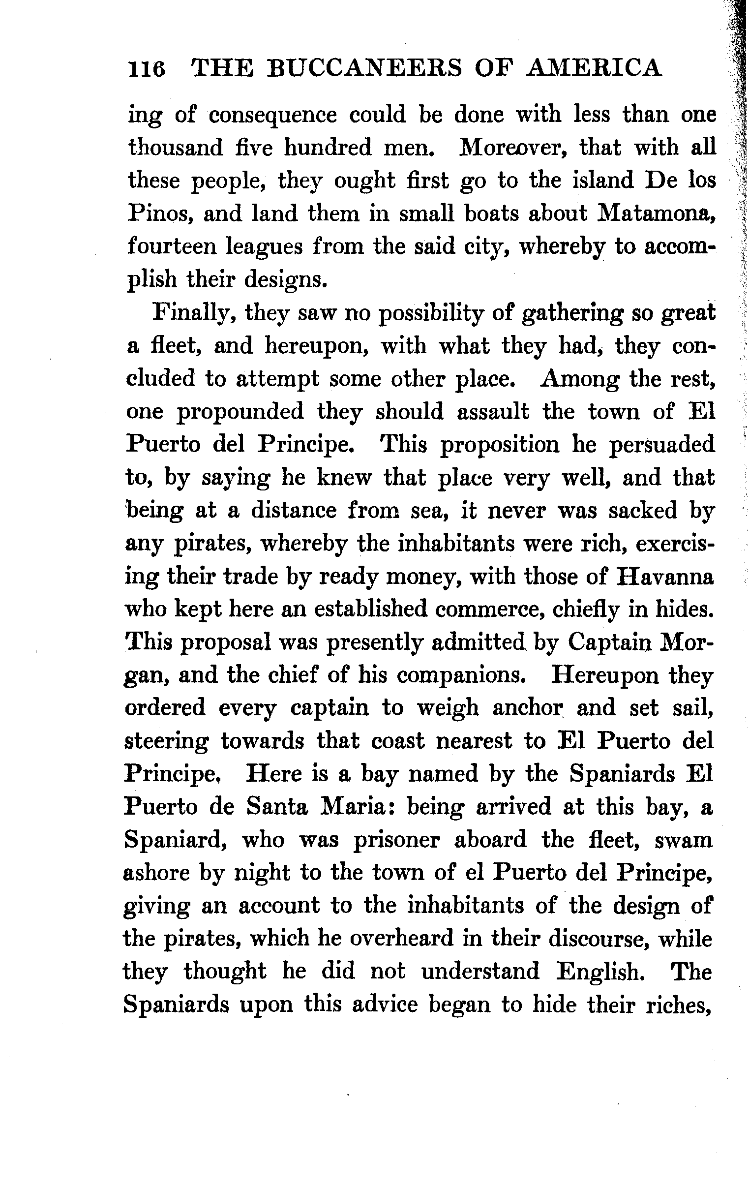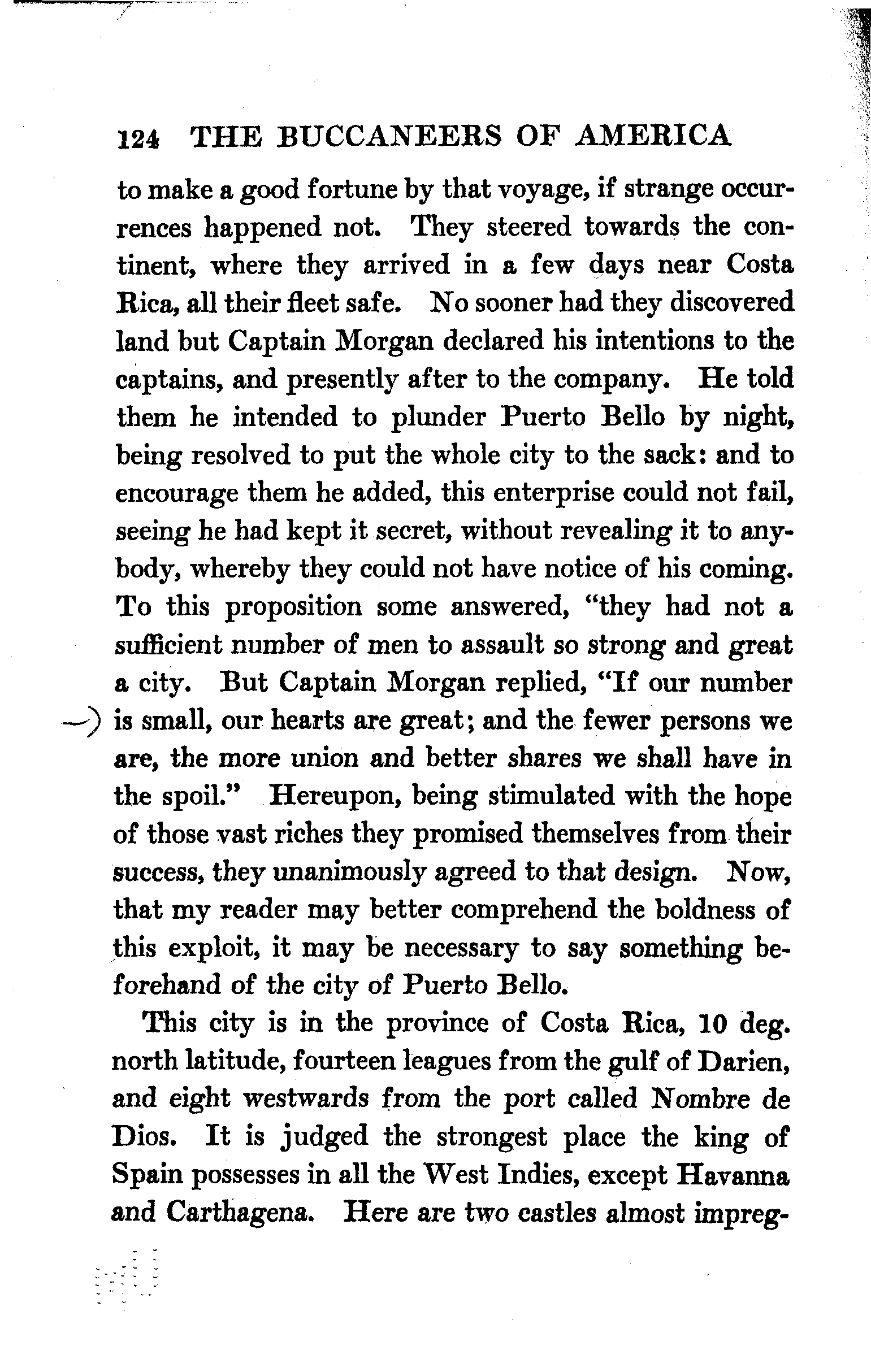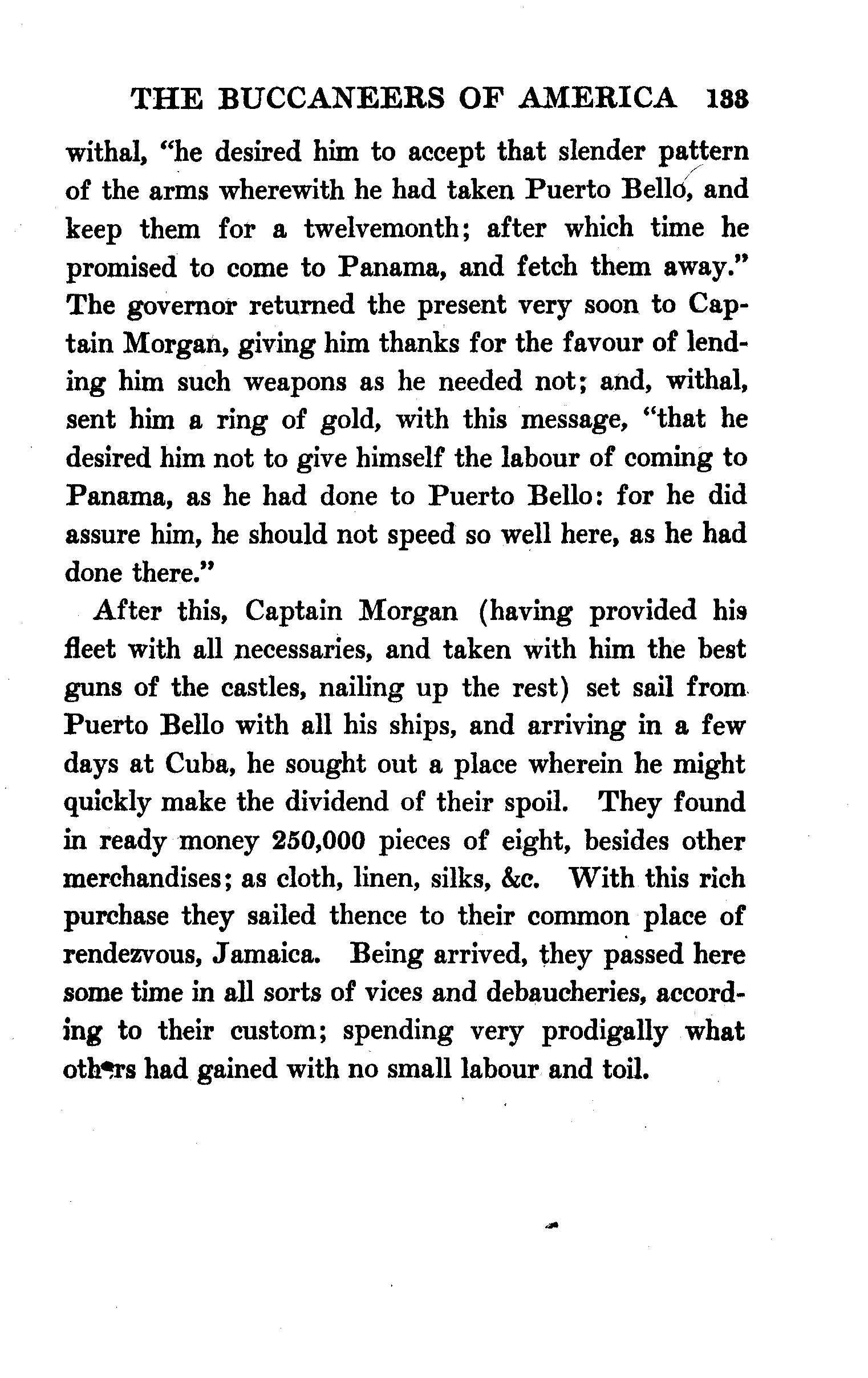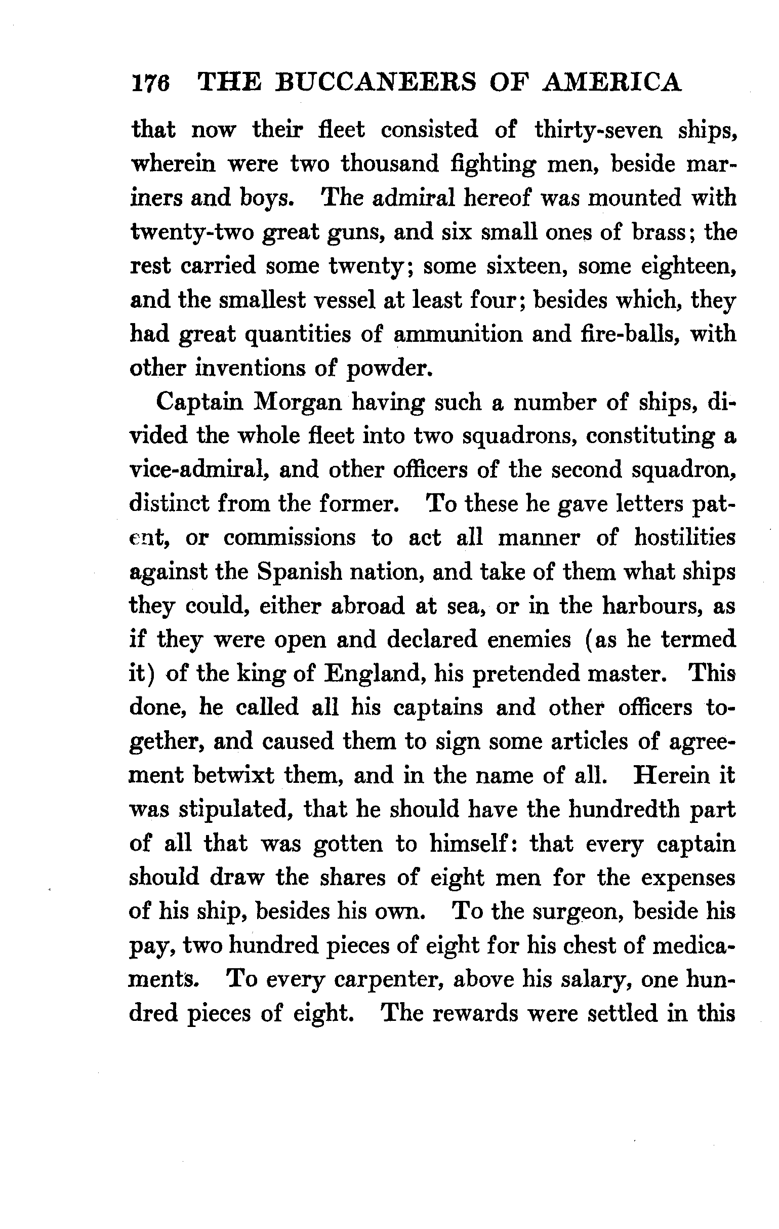 This contract being signed, Captain Morgan commanded his vice-admirals and captains to put all things in order, to attempt one of these three places; either Carthagena, Panama, or Vera Cruz. But the lot fell on Panama, as the richest of all three; though this city being situate at such a distance from the North Sea as they knew not well the approaches to it, they judged it necessary to go beforehand to the isle of St. Catherine, there to find some persons for guides in this enterprise; for in the garrison there are commonly many banditti and outlaws belonging to Panama and the neighbouring places, who are very expert in the knowledge of that country. But before they proceeded, they published an[178] act through the whole fleet, promising, if they met with any Spanish vessel, the first captain who should take it should have for his reward the tenth part of what should be found in her.[179]