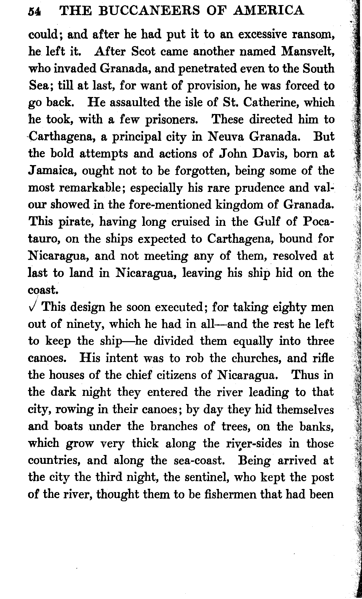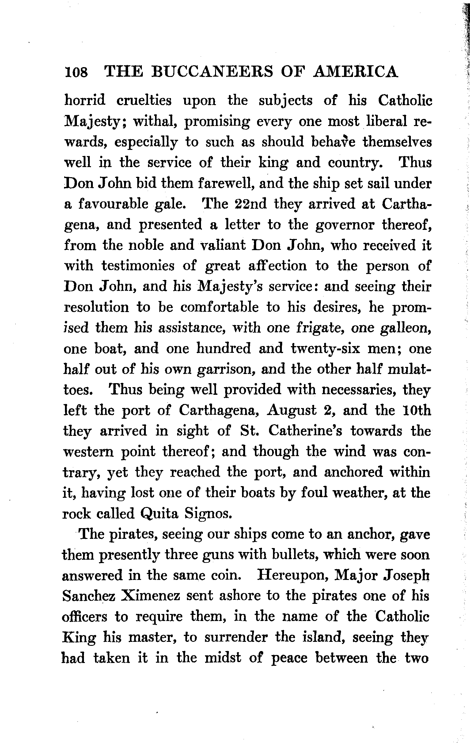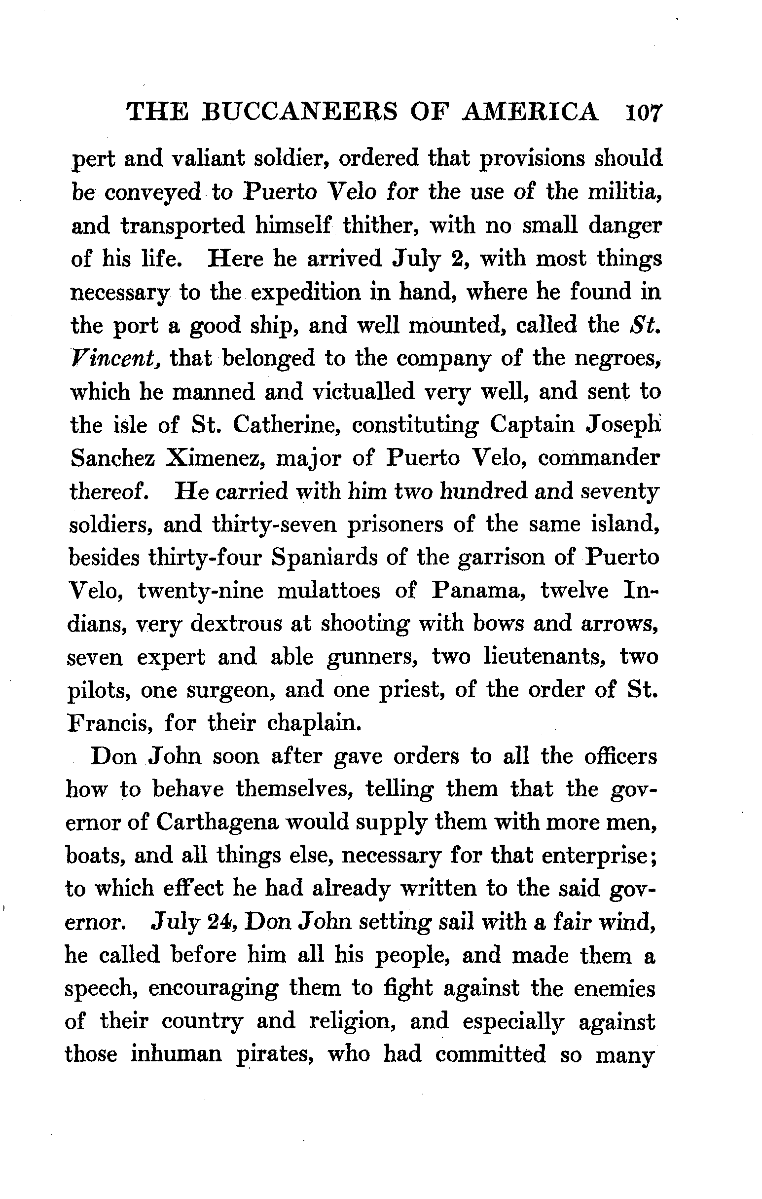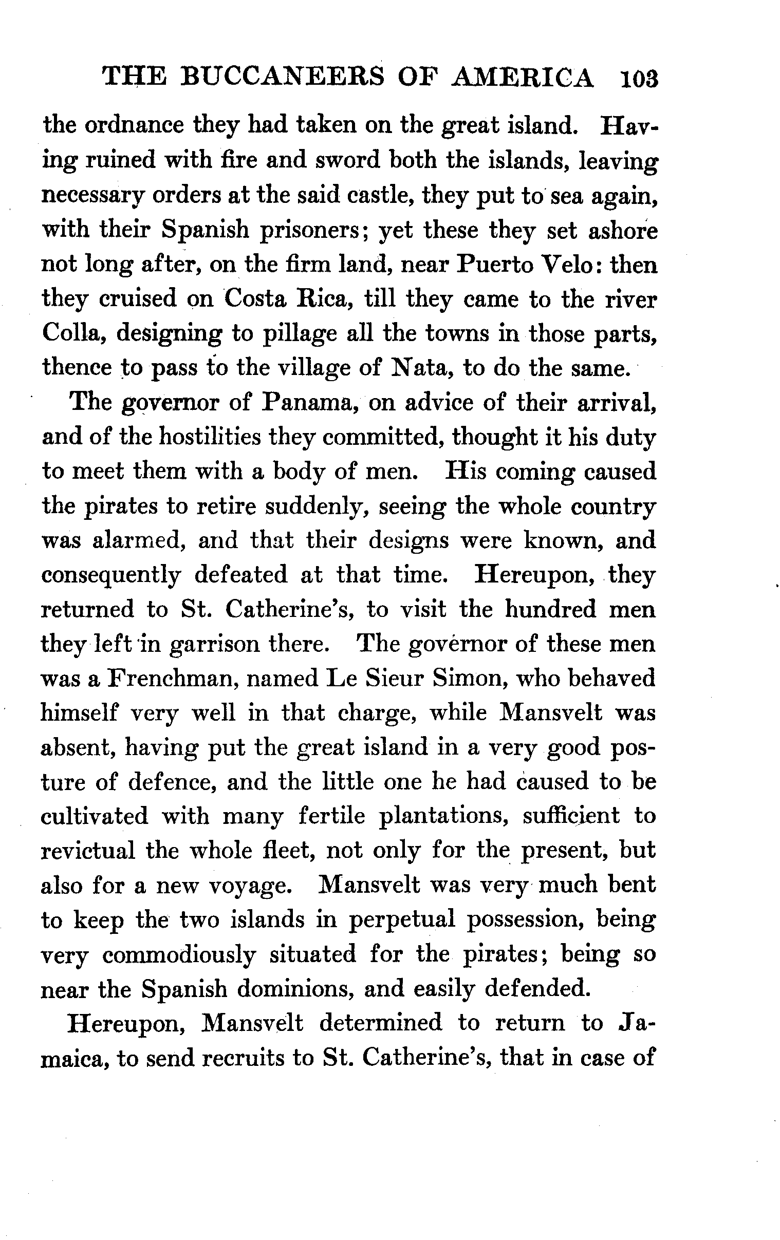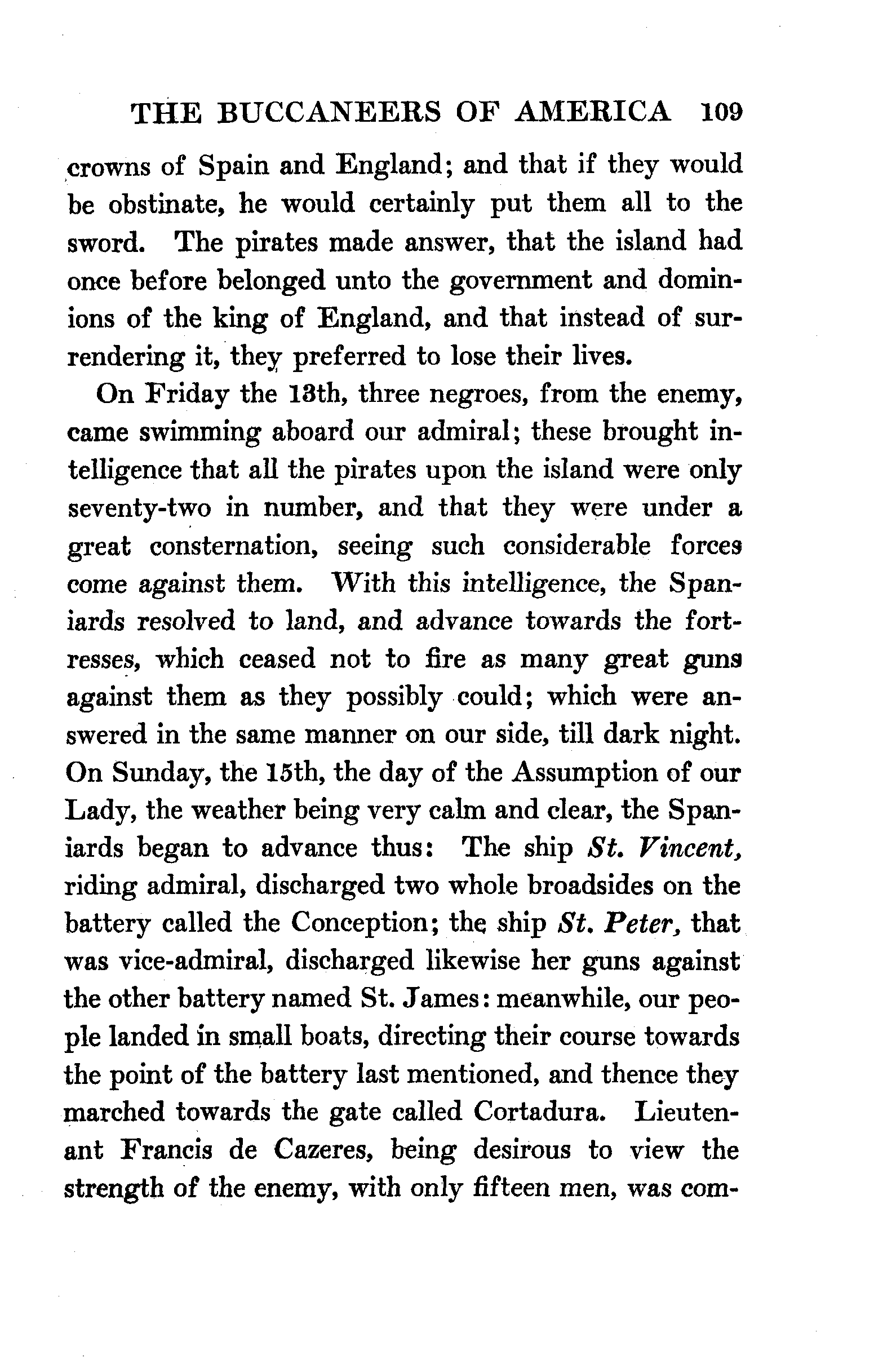 This contract being signed, Captain Morgan commanded his vice-admirals and captains to put all things in order, to attempt one of these three places; either Carthagena, Panama, or Vera Cruz. But the lot fell on Panama, as the richest of all three; though this city being situate at such a distance from the North Sea as they knew not well the approaches to it, they judged it necessary to go beforehand to the isle of St. Catherine, there to find some persons for guides in this enterprise; for in the garrison there are commonly many banditti and outlaws belonging to Panama and the neighbouring places, who are very expert in the knowledge of that country. But before they proceeded, they published an[178] act through the whole fleet, promising, if they met with any Spanish vessel, the first captain who should take it should have for his reward the tenth part of what should be found in her.[179]