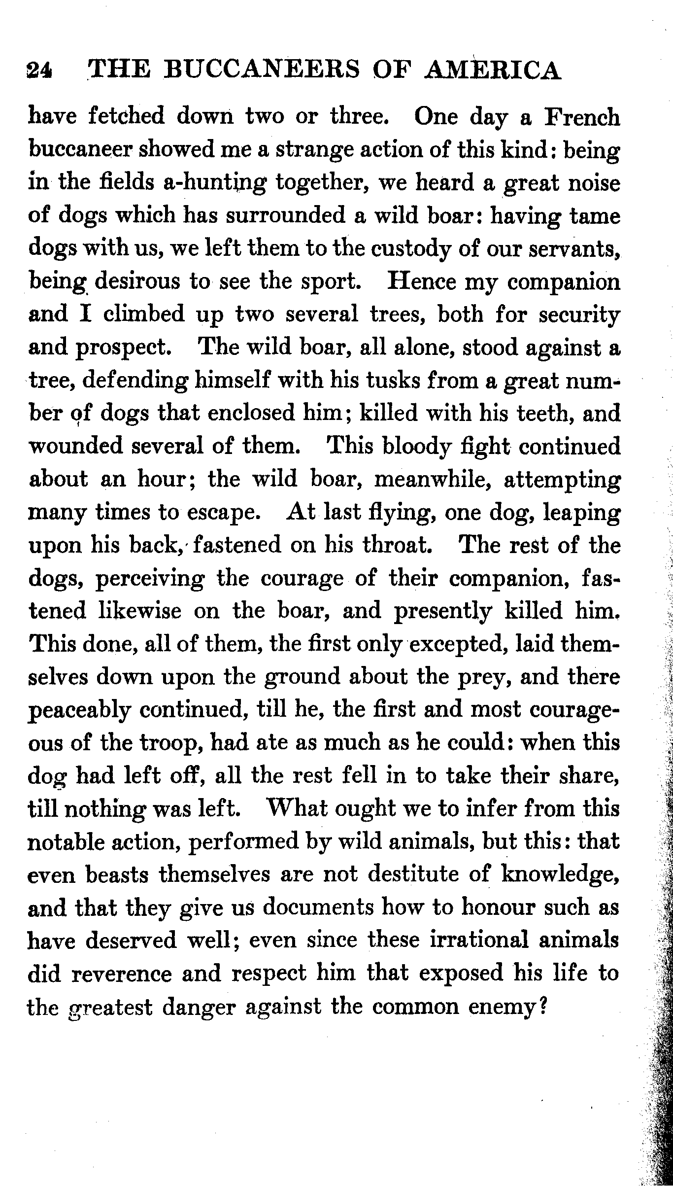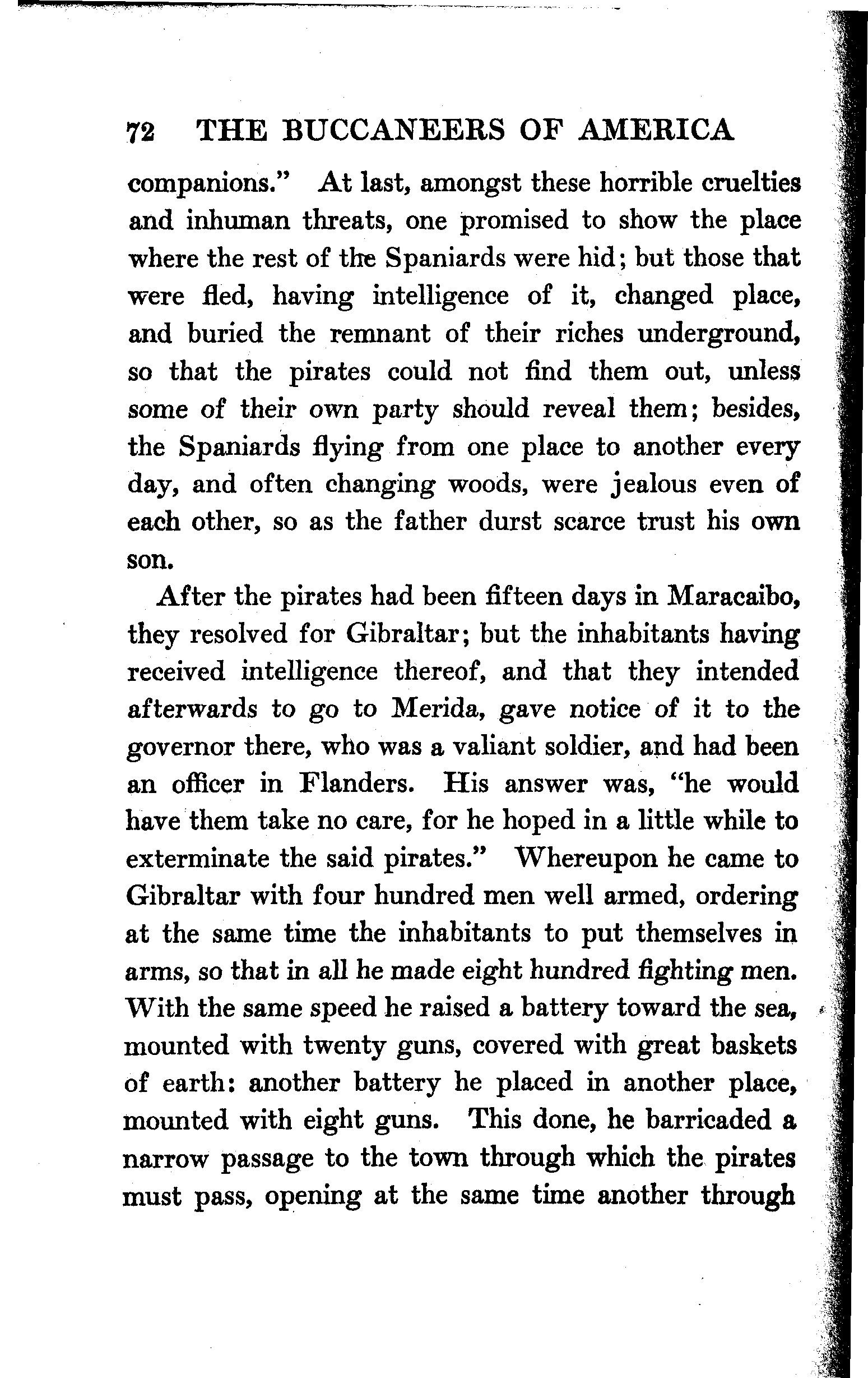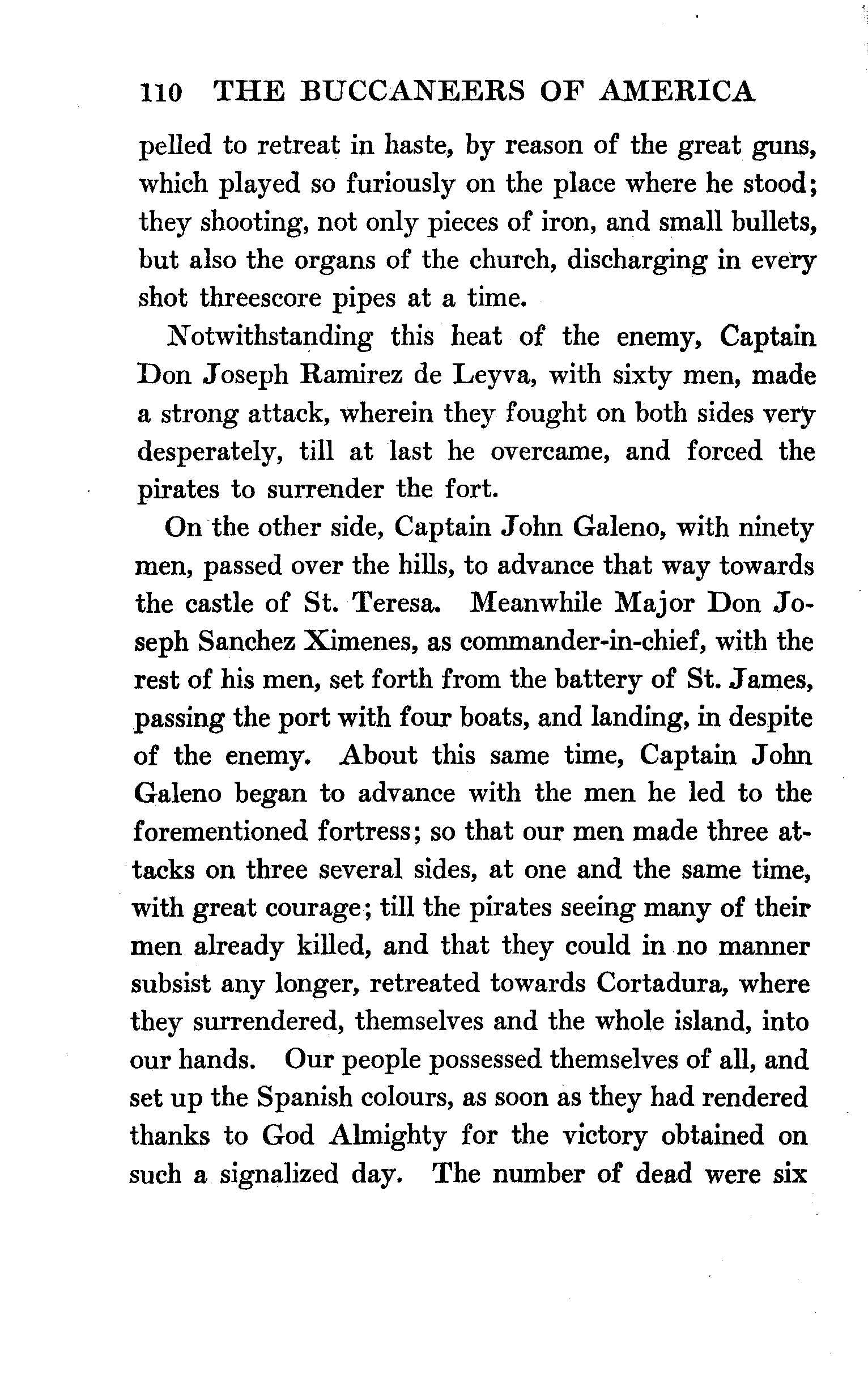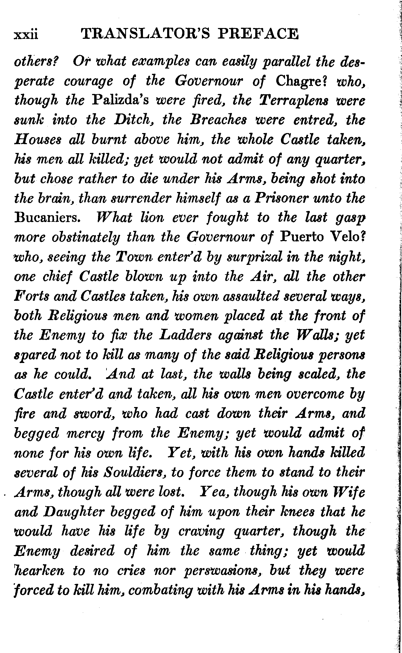 Next, as to the personal Valour of many of their Commanders, What man ever behaved himself more briskly than the Governour of Gibraltar, than the Governour of Puerto del Principe, both dying for the defence of their Towns; than Don Alonso del Campo, and[xxii] others? Or what examples can easily parallel the desperate courage of the Governour of Chagre? who, though the Palizda's were fired, the Terraplens were sunk into the Ditch, the Breaches were entred, the Houses all burnt above him, the whole Castle taken, his men all killed; yet would not admit of any quarter, but chose rather to die under his Arms, being shot into the brain, than surrender himself as a Prisoner unto the Bucaniers. What lion ever fought to the last gasp more obstinately than the Governour of Puerto Velo? who, seeing the Town enter'd by surprizal in the night, one chief Castle blown up into the Air, all the other Forts and Castles taken, his own assaulted several ways, both Religious men and women placed at the front of the Enemy to fix the Ladders against the Walls; yet spared not to kill as many of the said Religious persons as he could. And at last, the walls being scaled, the Castle enter'd and taken, all his own men overcome by fire and sword, who had cast down their Arms, and begged mercy from the Enemy; yet would admit of none for his own life. Yet, with his own hands killed several of his Souldiers, to force them to stand to their Arms, though all were lost. Yea, though his own Wife and Daughter begged of him upon their knees that he would have his life by craving quarter, though the Enemy desired of him the same thing; yet would hearken to no cries nor perswasions, but they were forced to kill him, combating with his Arms in his hands,[xxiii] being not otherwise able to take him Prisoner, as they were desirous to do. Shall these men be said to be influenced with Cowardize, who thus acted to the very last Scene of their own Tragedies? Or shall we rather say that they wanted no Courage, but Fortune? It being certainly true, that he who is killed in a Batel, may be equally couragious with him that killeth. And that whosoever derogateth from the Valour of the Spaniards in the West-Indies, diminisheth in like manner the Courage of the Bucaniers, his own Country-men, who have seemed to act beyond mortal men in America.