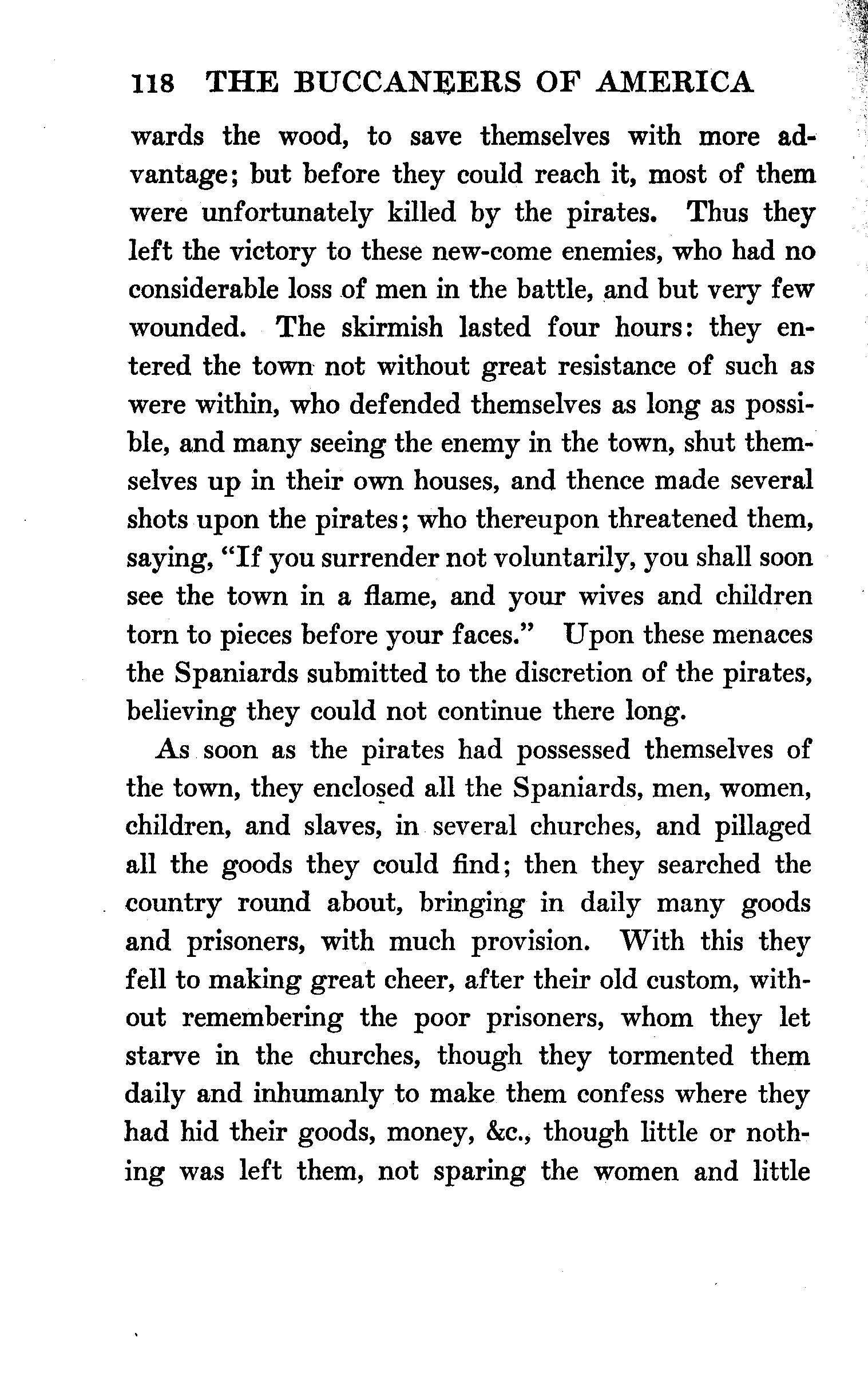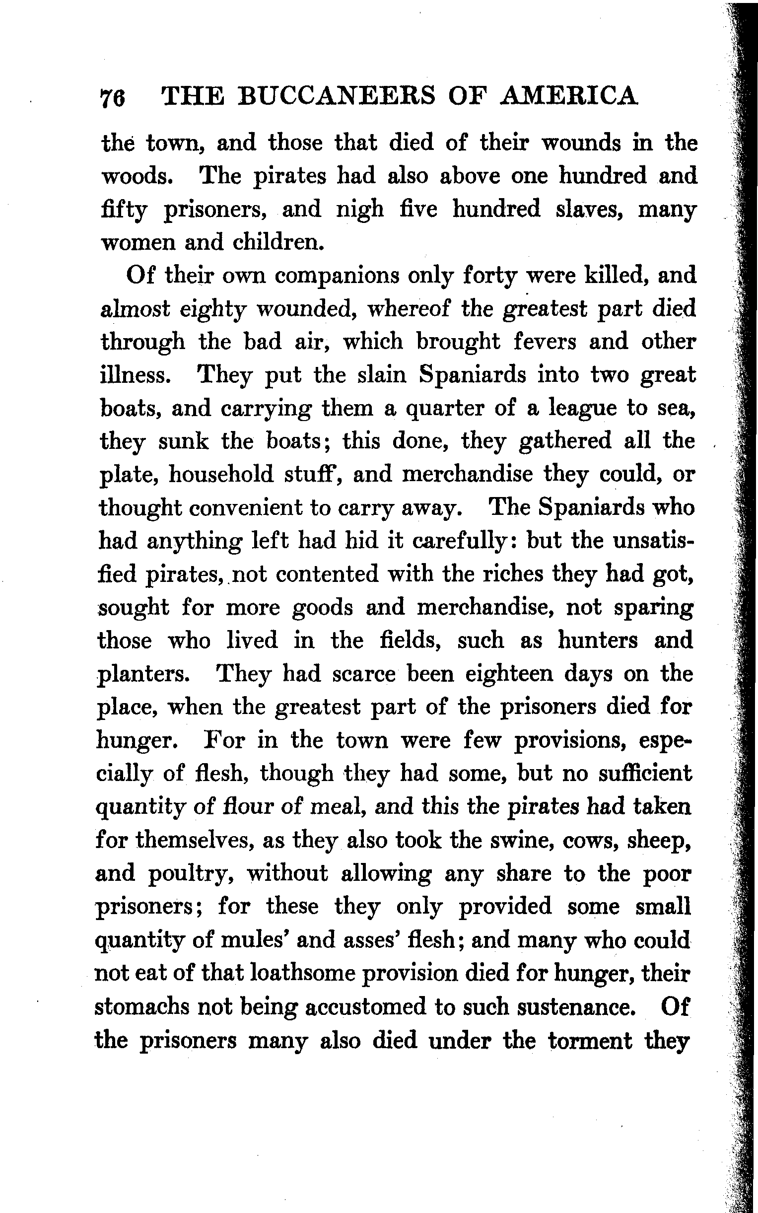 The taking of this castle cost the pirates excessively dear, in comparison to what they were wont to lose, and their toil and labour was greater than at the conquest of the isle of St. Catherine; for, numbering their men, they had lost above a hundred, beside seventy[193] wounded. They commanded the Spanish prisoners to cast the dead bodies of their own men from the top of the mountain to the seaside, and to bury them. The wounded were carried to the church, of which they made an hospital, and where also they shut up the women.
