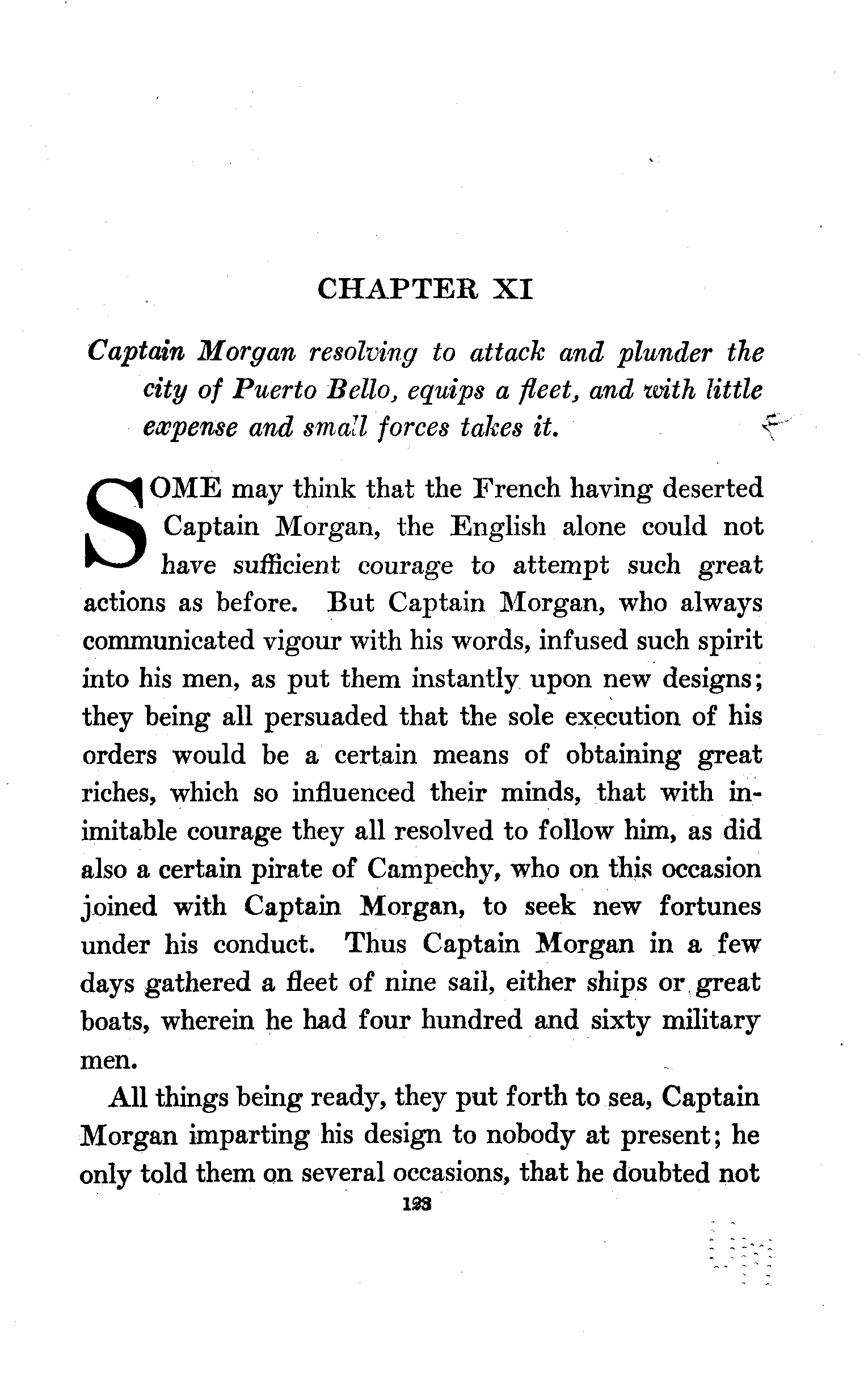 | Captain Morgan resolving to attack and plunder the City of Puerto Bello, equips a fleet, and with little expense and small forces takes it | 123 |