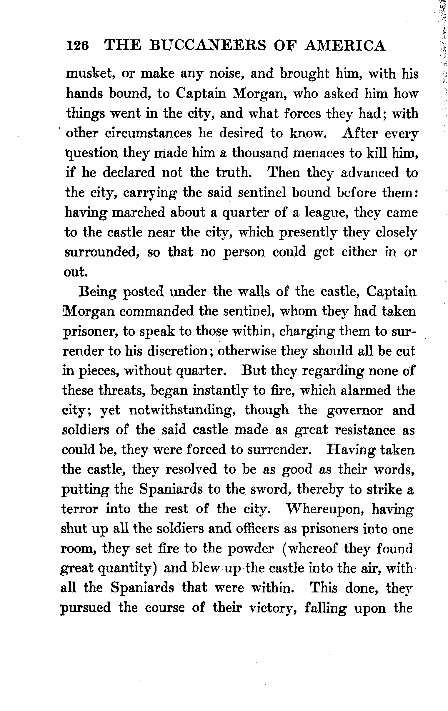 The fire within the castle still continuing, the pirates from abroad did what they could to hinder its progress, by shooting incessantly against it; one party of them was employed only for this, while another watched all the motions of the Spaniards. About noon the English gained a breach, which the governor himself defended with twenty-five soldiers. Here was made a very courageous resistance by the Spaniards, with muskets, pikes, stones, and swords; but through all these the pirates fought their way, till they gained the castle. The Spaniards, who remained alive, cast themselves down from the castle into the sea, choosing rather to die thus (few or none surviving the fall) than to ask quarter for their lives. The governor himself retreated to the corps du gard, before which were placed two pieces of cannon: here he still defended himself, not demanding any quarter, till he was killed with a musket-shot in the head.