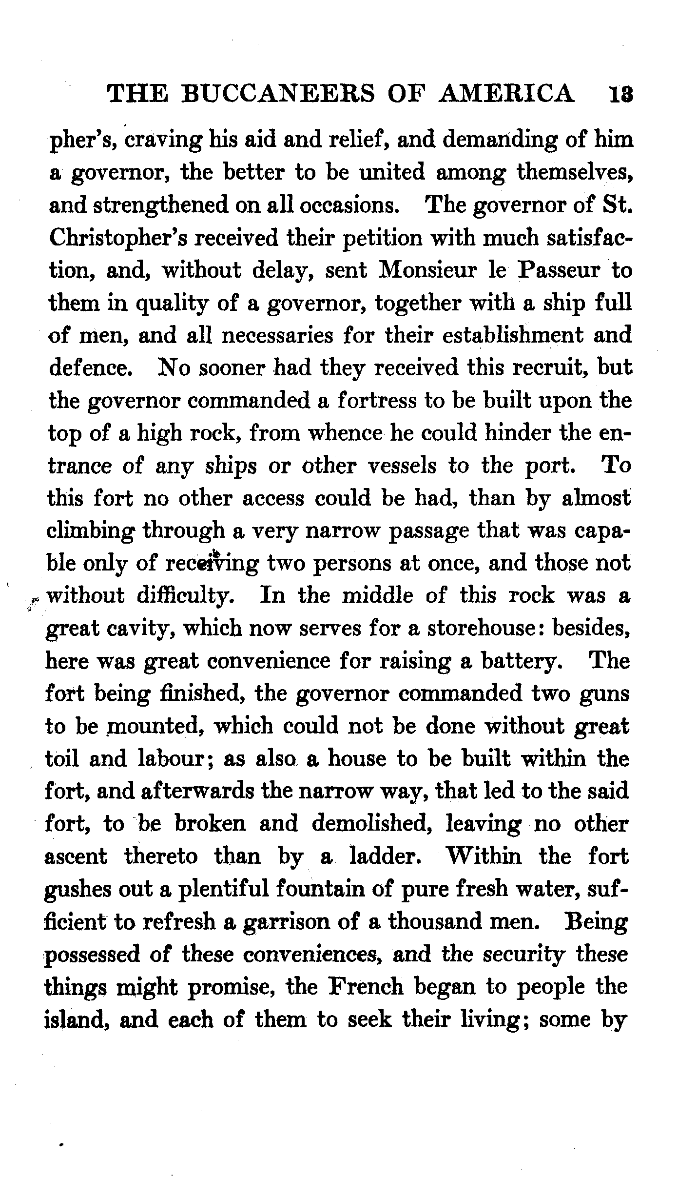 Meanwhile, the Spaniards of the great island ceased not to seek after their new guests, the French, with intent to root them out of the woods if possible, or cause them to perish with hunger; but this design soon failed, having found that the French were masters both of good guns, powder, and bullets. Here therefore the fugitives waited for a certain opportunity, wherein they knew the Spaniards were to come from Tortuga with arms, and a great number of men, to join with those of the greater island for their destruction. When this occasion offered, they in the meanwhile deserting the woods where they were, returned to Tortuga, and dispossessed the small number of Spaniards that remained at home. Having so done, they fortified themselves the best they could, thereby to prevent the return of the Spaniards in case they should attempt it. Moreover, they sent immediately to the governor of St. Christo[13]pher's, craving his aid and relief, and demanding of him a governor, the better to be united among themselves, and strengthened on all occasions. The governor of St. Christopher's received their petition with much satisfaction, and, without delay, sent Monsieur le Passeur to them in quality of a governor, together with a ship full of men, and all necessaries for their establishment and defence. No sooner had they received this recruit, but the governor commanded a fortress to be built upon the top of a high rock, from whence he could hinder the entrance of any ships or other vessels to the port. To this fort no other access could be had, than by almost climbing through a very narrow passage that was capable only of receiving two persons at once, and those not without difficulty. In the middle of this rock was a great cavity, which now serves for a storehouse: besides, here was great convenience for raising a battery. The fort being finished, the governor commanded two guns to be mounted, which could not be done without great toil and labour; as also a house to be built within the fort, and afterwards the narrow way, that led to the said fort, to be broken and demolished, leaving no other ascent thereto than by a ladder. Within the fort gushes out a plentiful fountain of pure fresh water, sufficient to refresh a garrison of a thousand men. Being possessed of these conveniences, and the security these things might promise, the French began to people the island, and each of them to seek their living; some by[14] hunting, others by planting tobacco, and others by cruizing and robbing upon the coasts of the Spanish islands, which trade is continued by them to this day.