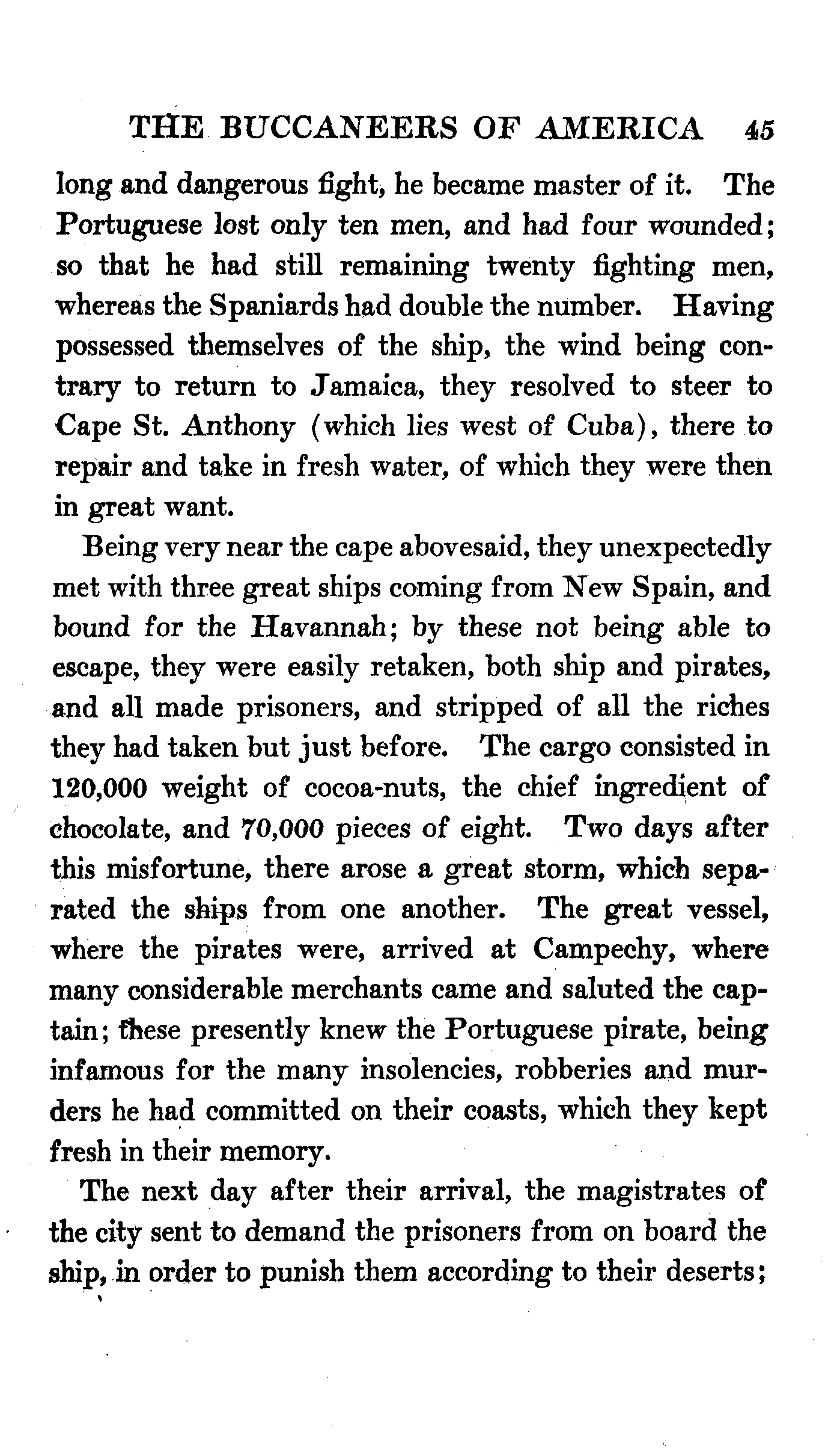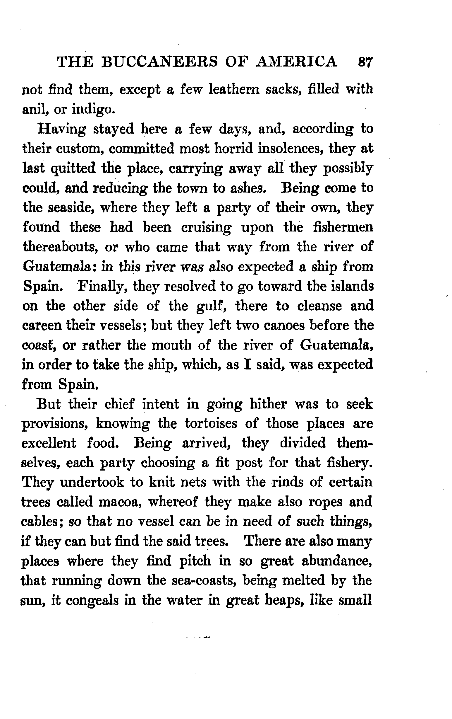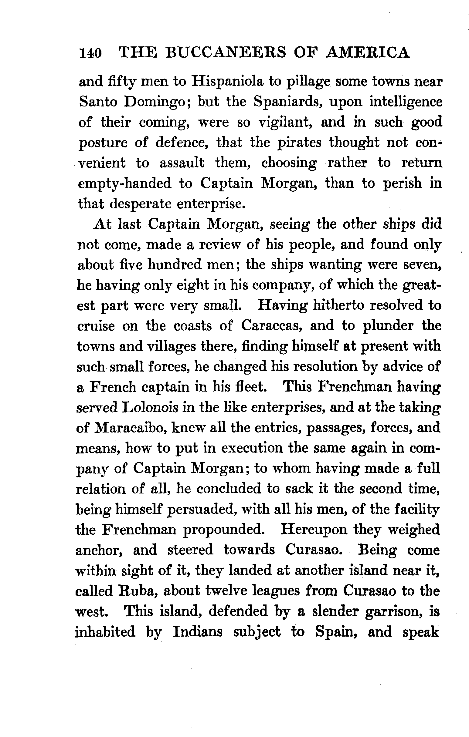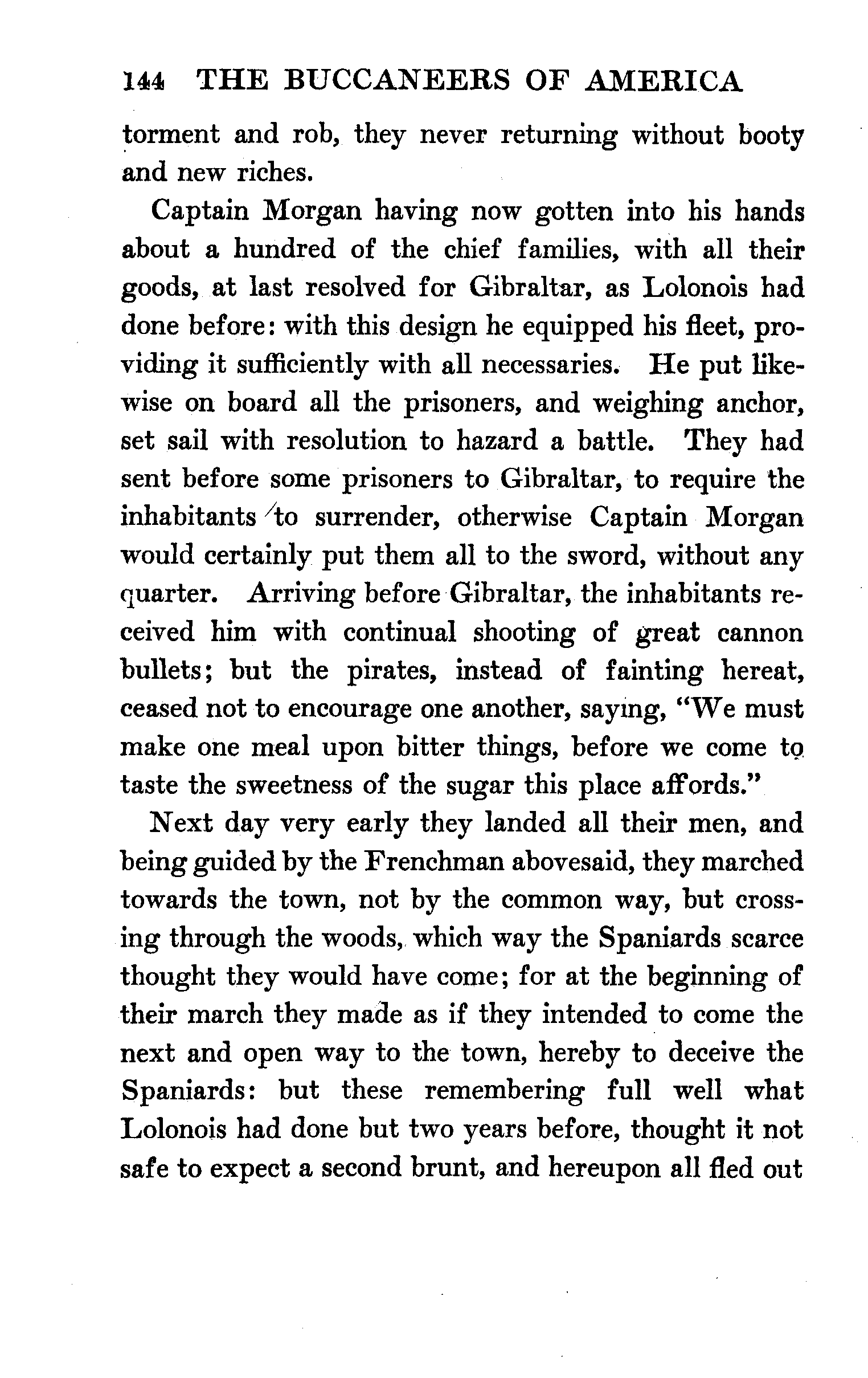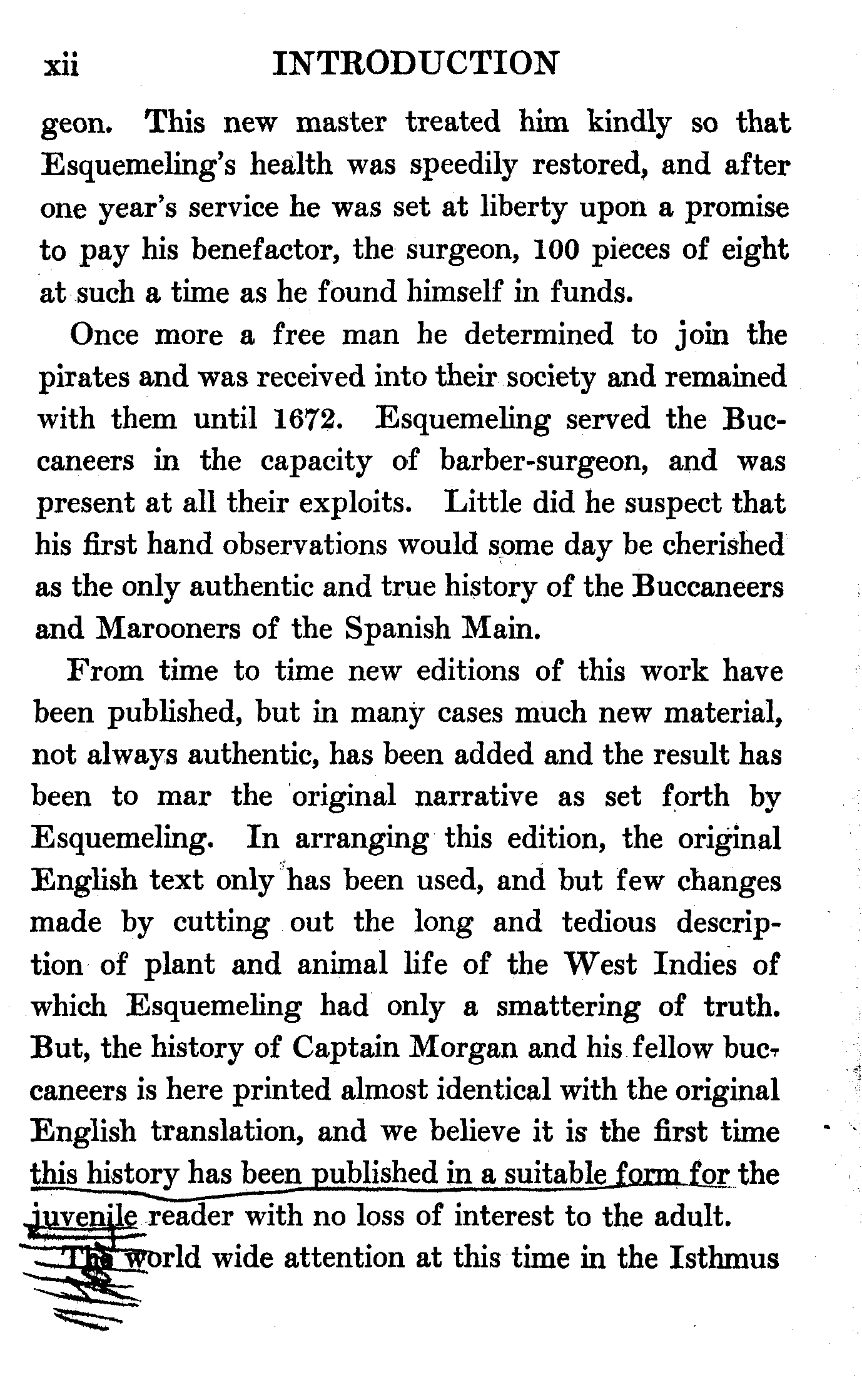 From time to time new editions of this work have been published, but in many cases much new material, not always authentic, has been added and the result has been to mar the original narrative as set forth by Esquemeling. In arranging this edition, the original English text only has been used, and but few changes made by cutting out the long and tedious description of plant and animal life of the West Indies of which Esquemeling had only a smattering of truth. But, the history of Captain Morgan and his fellow buccaneers is here printed almost identical with the original English translation, and we believe it is the first time this history has been published in a suitable form for the juvenile reader with no loss of interest to the adult.