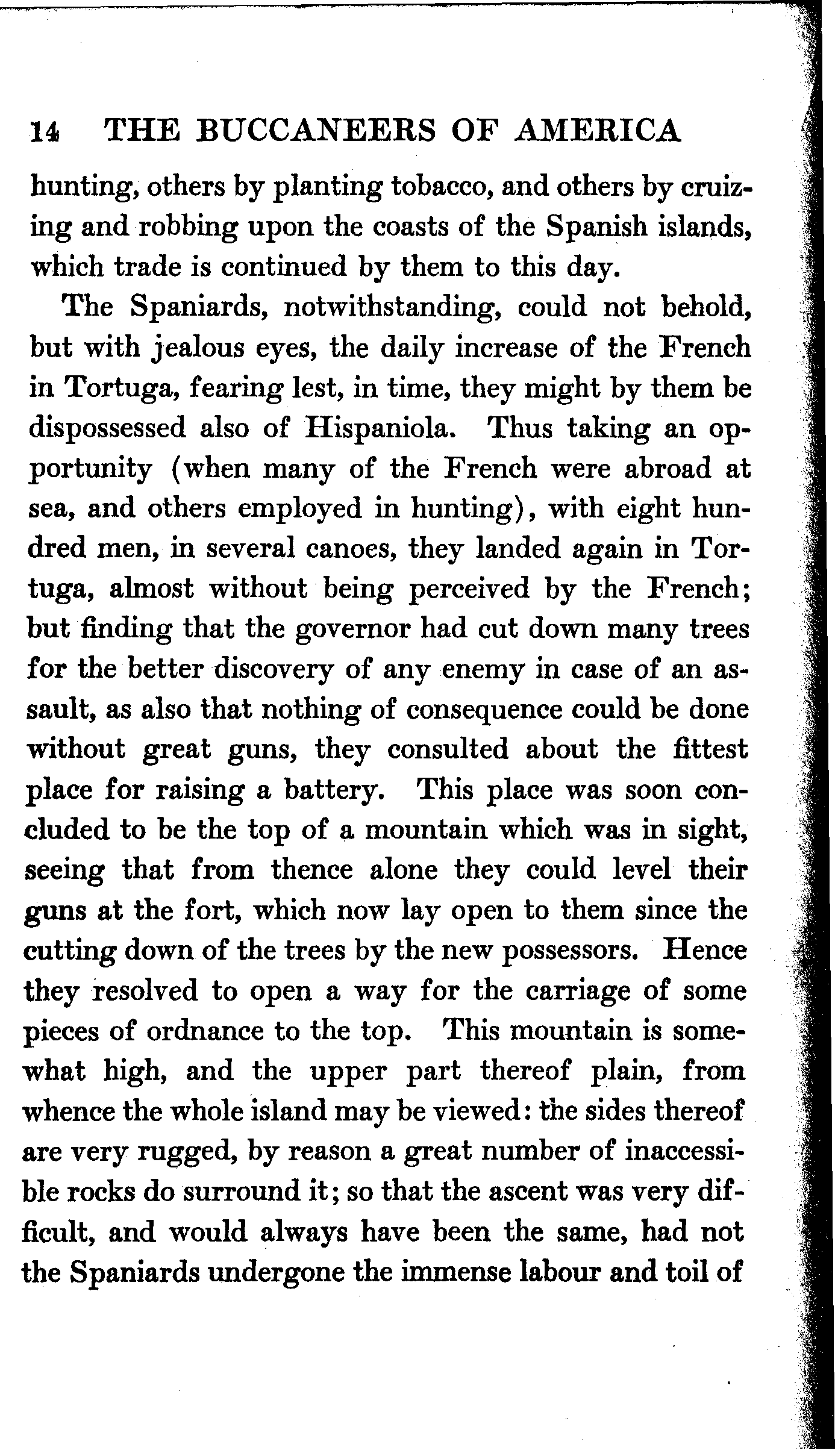 The Spaniards, notwithstanding, could not behold, but with jealous eyes, the daily increase of the French in Tortuga, fearing lest, in time, they might by them be dispossessed also of Hispaniola. Thus taking an opportunity (when many of the French were abroad at sea, and others employed in hunting), with eight hundred men, in several canoes, they landed again in Tortuga, almost without being perceived by the French; but finding that the governor had cut down many trees for the better discovery of any enemy in case of an assault, as also that nothing of consequence could be done without great guns, they consulted about the fittest place for raising a battery. This place was soon concluded to be the top of a mountain which was in sight, seeing that from thence alone they could level their guns at the fort, which now lay open to them since the cutting down of the trees by the new possessors. Hence they resolved to open a way for the carriage of some pieces of ordnance to the top. This mountain is somewhat high, and the upper part thereof plain, from whence the whole island may be viewed: the sides thereof are very rugged, by reason a great number of inaccessible rocks do surround it; so that the ascent was very difficult, and would always have been the same, had not the Spaniards undergone the immense labour and toil of[15] making the way before mentioned, as I shall now relate.