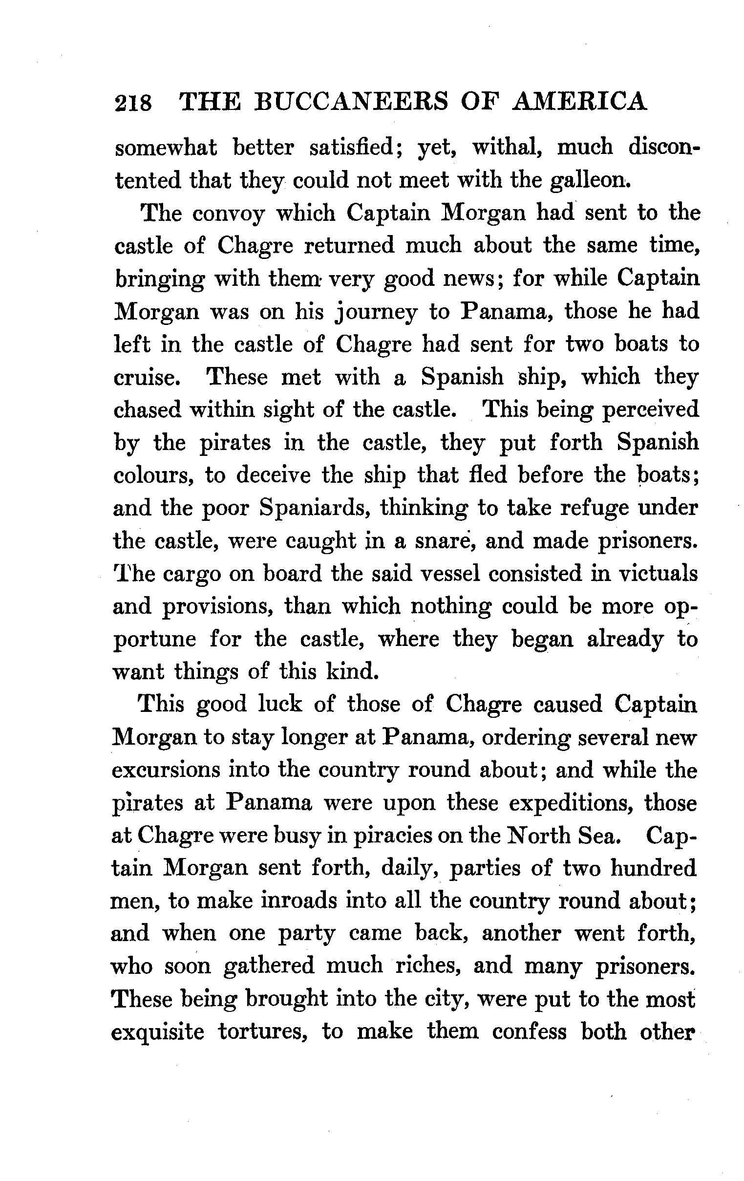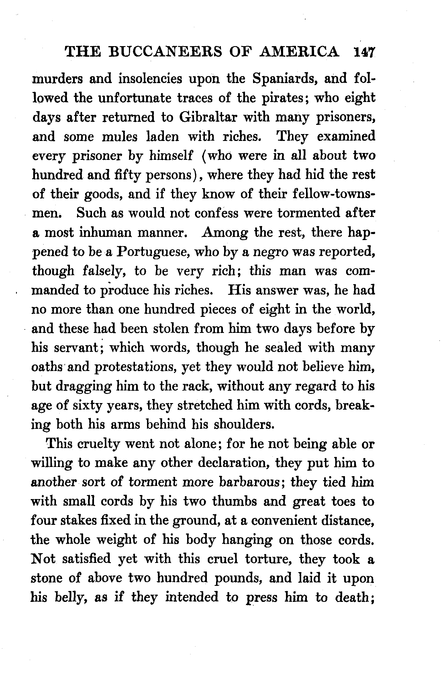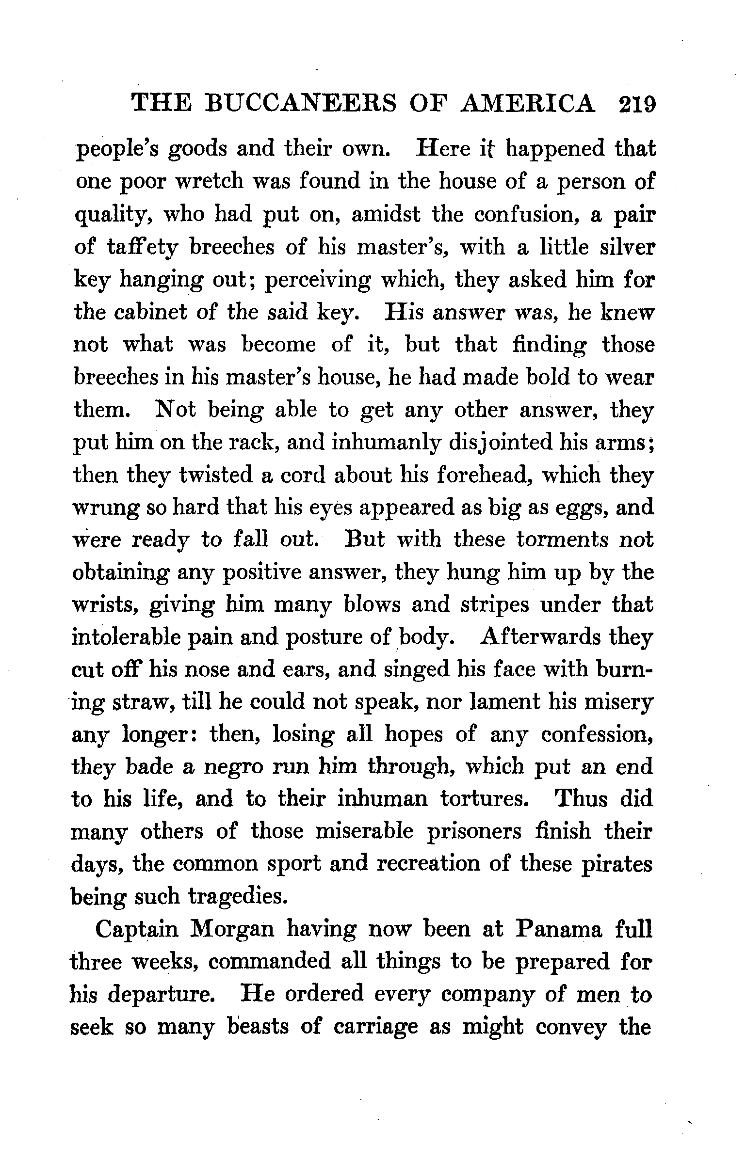 This good luck of those of Chagre caused Captain Morgan to stay longer at Panama, ordering several new excursions into the country round about; and while the pirates at Panama were upon these expeditions, those at Chagre were busy in piracies on the North Sea. Captain Morgan sent forth, daily, parties of two hundred men, to make inroads into all the country round about; and when one party came back, another went forth, who soon gathered much riches, and many prisoners. These being brought into the city, were put to the most exquisite tortures, to make them confess both other[219] people's goods and their own. Here it happened that one poor wretch was found in the house of a person of quality, who had put on, amidst the confusion, a pair of taffety breeches of his master's, with a little silver key hanging out; perceiving which, they asked him for the cabinet of the said key. His answer was, he knew not what was become of it, but that finding those breeches in his master's house, he had made bold to wear them. Not being able to get any other answer, they put him on the rack, and inhumanly disjointed his arms; then they twisted a cord about his forehead, which they wrung so hard that his eyes appeared as big as eggs, and were ready to fall out. But with these torments not obtaining any positive answer, they hung him up by the wrists, giving him many blows and stripes under that intolerable pain and posture of body. Afterwards they cut off his nose and ears, and singed his face with burning straw, till he could not speak, nor lament his misery any longer: then, losing all hopes of any confession, they bade a negro run him through, which put an end to his life, and to their inhuman tortures. Thus did many others of those miserable prisoners finish their days, the common sport and recreation of these pirates being such tragedies.