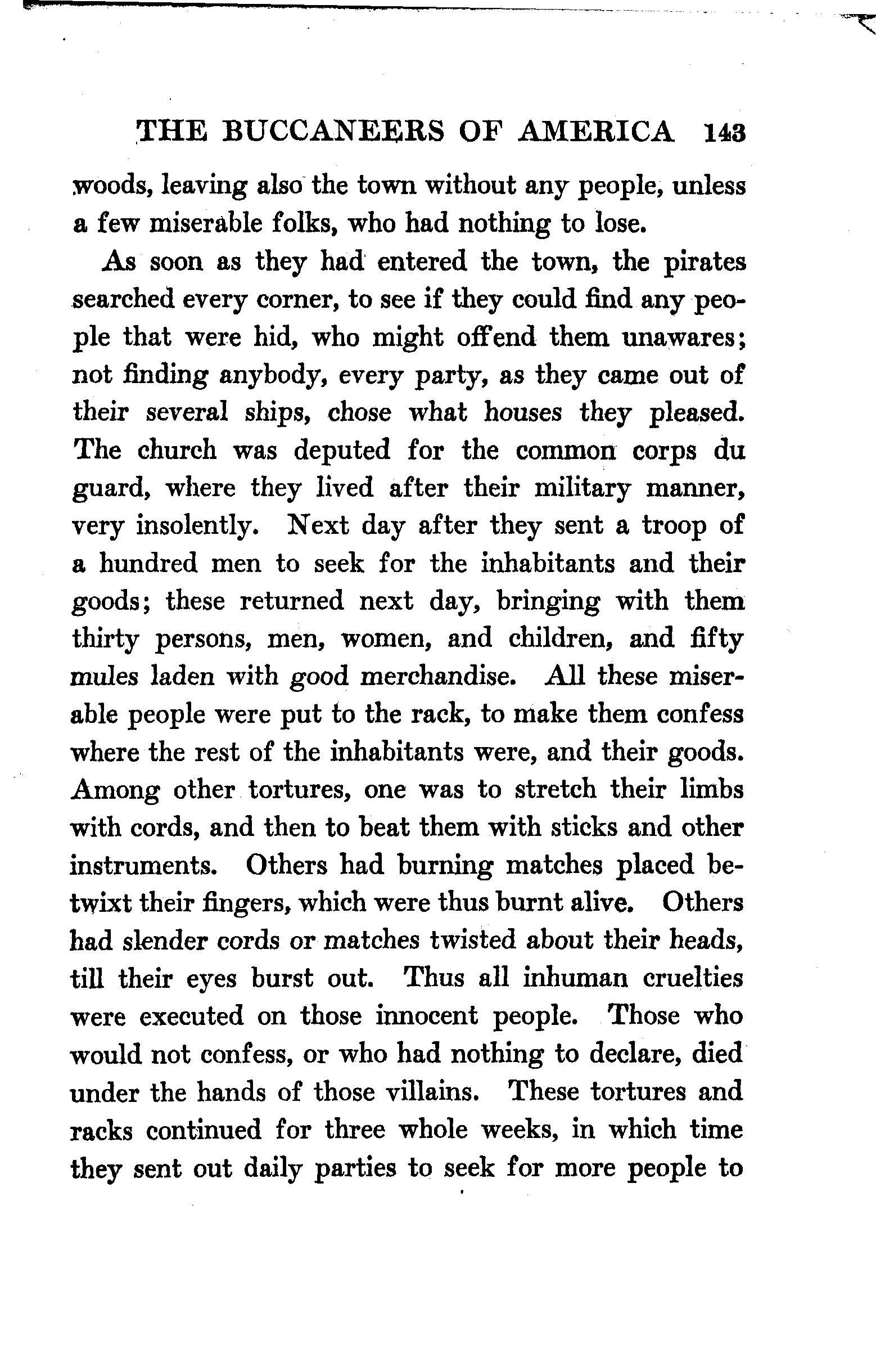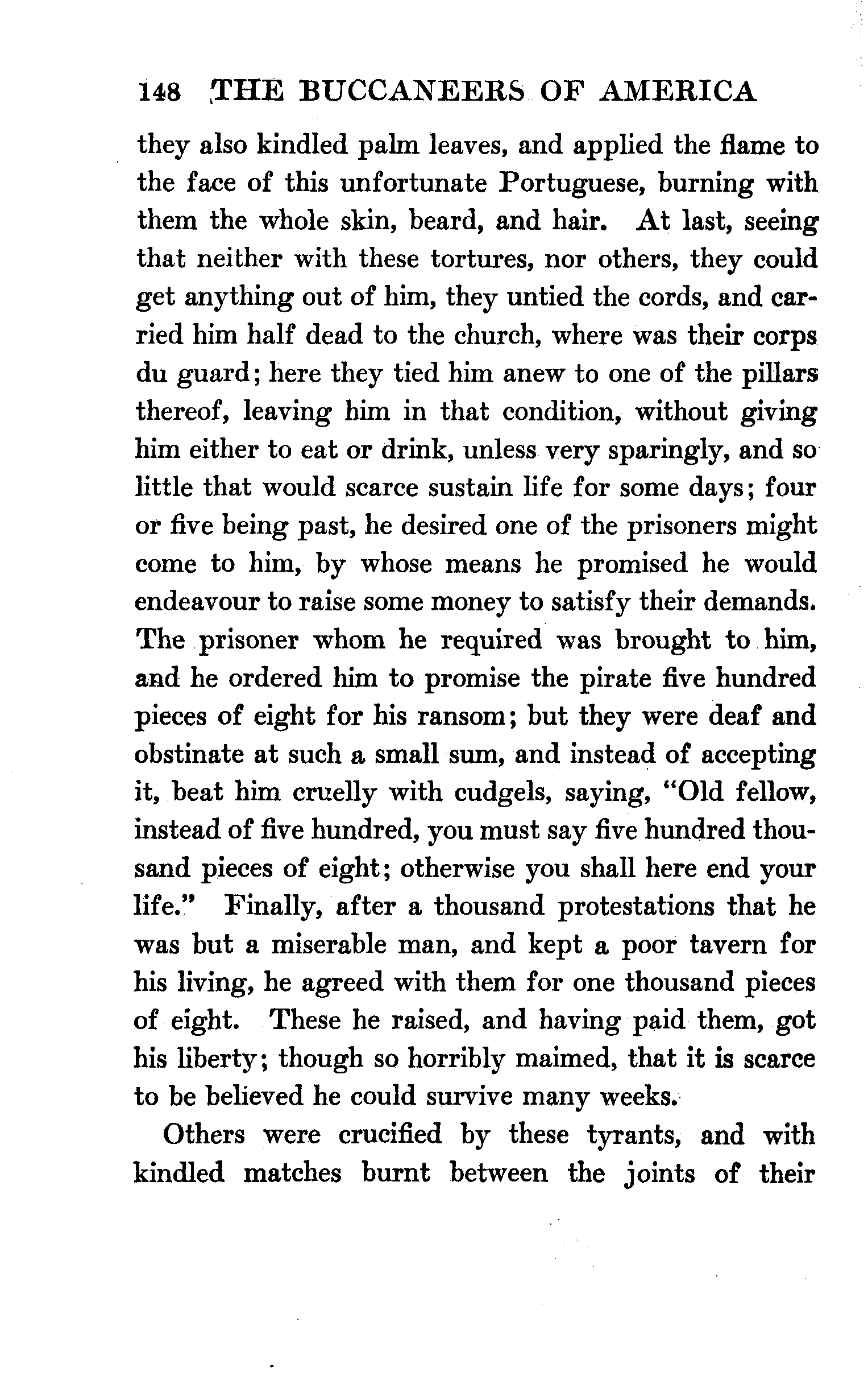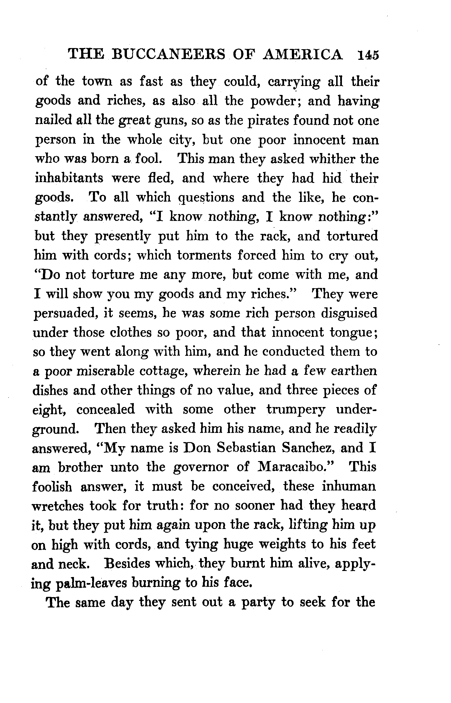 This good luck of those of Chagre caused Captain Morgan to stay longer at Panama, ordering several new excursions into the country round about; and while the pirates at Panama were upon these expeditions, those at Chagre were busy in piracies on the North Sea. Captain Morgan sent forth, daily, parties of two hundred men, to make inroads into all the country round about; and when one party came back, another went forth, who soon gathered much riches, and many prisoners. These being brought into the city, were put to the most exquisite tortures, to make them confess both other[219] people's goods and their own. Here it happened that one poor wretch was found in the house of a person of quality, who had put on, amidst the confusion, a pair of taffety breeches of his master's, with a little silver key hanging out; perceiving which, they asked him for the cabinet of the said key. His answer was, he knew not what was become of it, but that finding those breeches in his master's house, he had made bold to wear them. Not being able to get any other answer, they put him on the rack, and inhumanly disjointed his arms; then they twisted a cord about his forehead, which they wrung so hard that his eyes appeared as big as eggs, and were ready to fall out. But with these torments not obtaining any positive answer, they hung him up by the wrists, giving him many blows and stripes under that intolerable pain and posture of body. Afterwards they cut off his nose and ears, and singed his face with burning straw, till he could not speak, nor lament his misery any longer: then, losing all hopes of any confession, they bade a negro run him through, which put an end to his life, and to their inhuman tortures. Thus did many others of those miserable prisoners finish their days, the common sport and recreation of these pirates being such tragedies.
